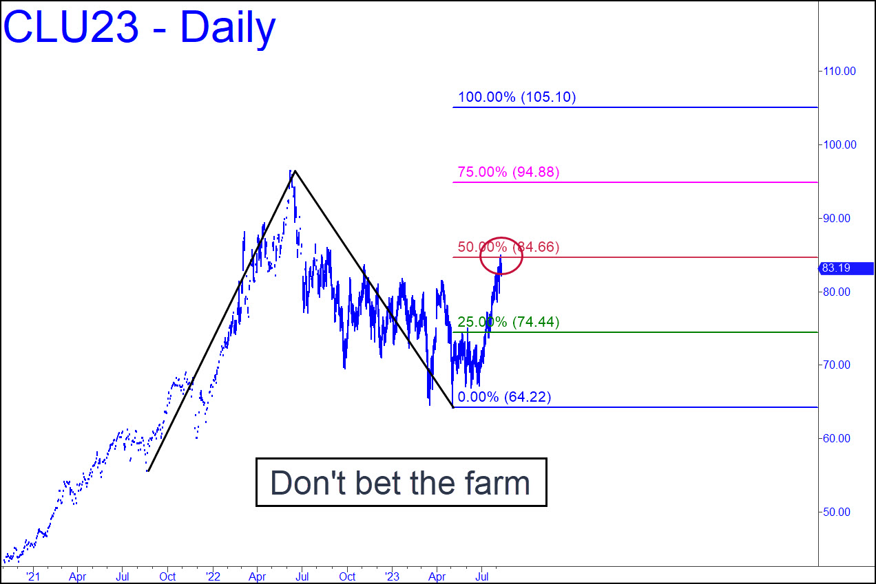 With gasoline prices in the East pushing well above $4, consumers could use some help from the 84.66 ‘midpoint Hidden Pivot resistance’ shown in the chart. It held against Friday’s surge, but it looks like a slender reed for beleaguered consumers to lean on. A decisive push past it would imply more upside to p2=94.88, at which point we may become nostalgic for $4 gas. A bright spot for investors is that because the stock market has come completely decoupled from reality, the crushing economic burden of higher energy prices has barely registered on Wall Street’s dim, fevered brain. ______ UPDATE (Aug 18): The bounce into Friday’s close looked menacing from the perspective of bears hoping the top a week ago at the 84.66 midpoint Hidden would endure. A decisive push past it would put the 94.88 ‘secondary’ pivot mentioned above in play, and possibly even D=105.10. Even a run-up to the lower target would be ruinous for motorists already challenged by soaring gas prices.