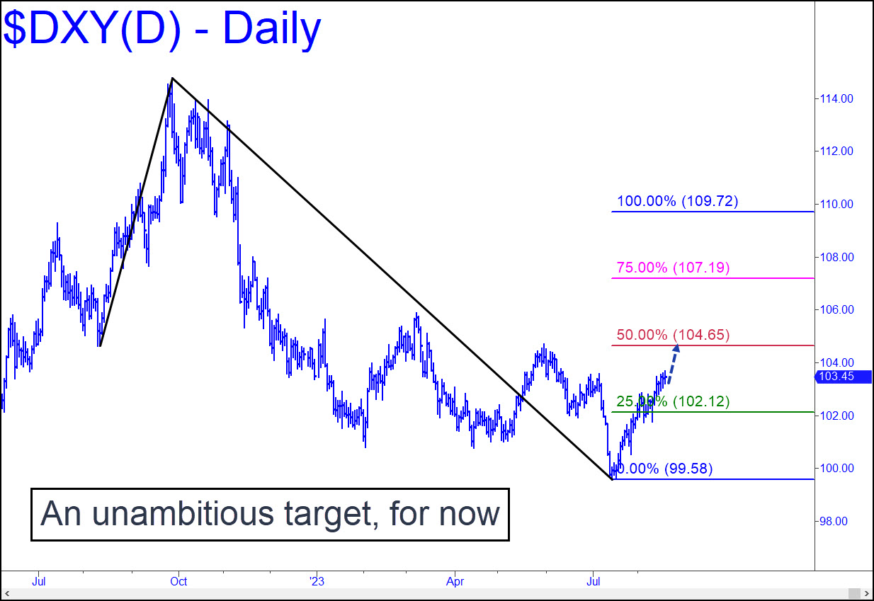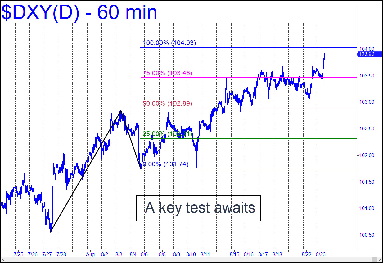 Since the dollar bettered my moderately bullish expectations last week, I’ve deployed a bigger reverse pattern that will give the rally more running room. Even so, we’ll be watching closely for a stall, possibly fatal, at p=104.65. That’s a midpoint Hidden Pivot resistance, and the usual rule applies: If it is impaled on first contact, that would shorten the odds of a further run-up to the next HP level, p2=107.19. The Matterhorn is March 8’s 105.88 print, and if it’s decisively exceeded, the 109.72 target would be in play. That could not but reflect a sea change in the global financial picture, so we’ll be keeping a close eye on the price benchmarks noted above. ______ UPDATE (Aug 23, 7:06 a.m. EDT): The dollar is headed for a crucial test of the 104.03 Hidden Pivot resistance shown in this chart. Remember, almost NO ONE wants a strong dollar, since it will increase the financial burden on EVERYONE who owes dollars. (Do you know anyone who doesn’t?) That is the chief and most destructive symptom of deflation, and it is a vastly larger creature than the relatively puny inflation that Covid stimulus loosed on the economy. The deflation juggernaut has been gathering irresistible force since long before Covid, and we may be about to find out whether its time has finally come. With mortgage rates above 7%, it is already enjoying a powerful tailwind.