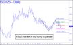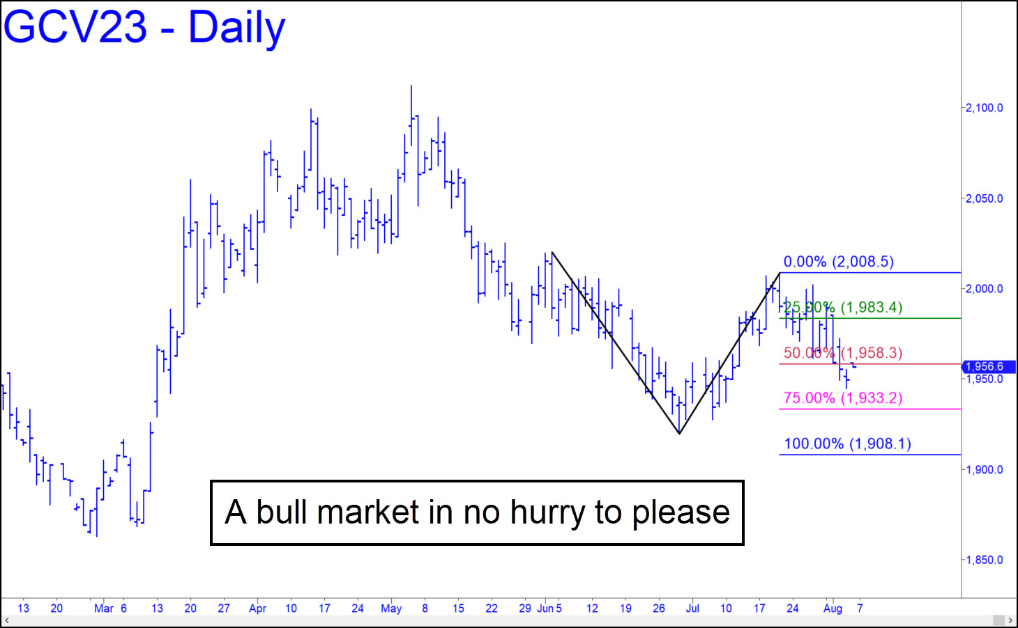 We need to keep reminding ourselves that even during those frustrating cycles when gold is being treated like garbage by investors, it is still in a long-term bull market. However, it has been so slow in developing that even hard-core bulls will find their patience tested to the limit. Accumulation is the strategy of choice, coupled with perseverance and discipline to make the ordeal seem worth the wait. To that end, we should be prepared for the correction begun from May’s all-time high at 2112 to come down t0 at least 1908 before bulls are sufficiently rested to mount another charge (of the Light Brigade?). The corrective segment shown in the chart has yet to trip a ‘mechanical’ short, but it would on a rally to 1983.40. Check for details in the chat room if the set-up should ripen, since the $10,000 theoretical entry risk on four contracts can be cut by 95% if we do it right.
