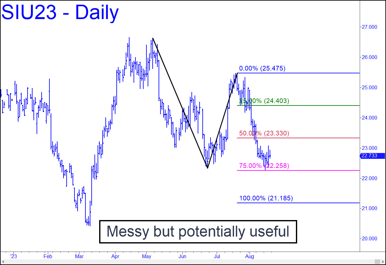 What a mess! Even so, the pattern shown in the chart meets our criteria for accuracy and reliability in subtle ways, so let’s assume the cycle of hard-selling begun from 25.47 a month ago is headed down to at least D=21.18. In the meantime, we should be alert to shorting opportunities if last week’s so-far weak bounce gets legs. A run-up to p=23.33 would trigger a relatively risky ‘mechanical’ short, stop 24.04, but there may easier ways to do it, so stay tuned to the chat room for timely guidance. ______ UPDATE (Aug 21, 9:29 a.m.): A subscriber reported shorting silver based on the above. My response n the chat room, for your guidance, was as follows: “My target missed the top of the nasty spike by 0.03, but I hadn’t expected it to be reached so dramatically. Is your stop at 24.04, the number in the tout? That implies 72 cents of theoretical entry risk. However, you could have cut that to 11 cents using an rABC set-up that triggered at 23.25, with 23.15 as the threshold for partial-profit-taking (15m, a=23.07 on 8/17.” D=22.93). _______ UPDATE (2:49 p.m.): The futures bottomed an inch from the 22.93 target I provided in the chat room, generating a profit of as much as $2,000 per contract for shorts from 34.33. Shorts covered near 22.93, then reversed and turned into long positions, could have made an additional $2,000 per contract, since the bounce took Sep Silver all the way back up to the intraday high. All the swings were gratuitous and orchestrated by thieves, but as I hope as has been demonstrated, such movement is perfectly predictable and easily tradeable.