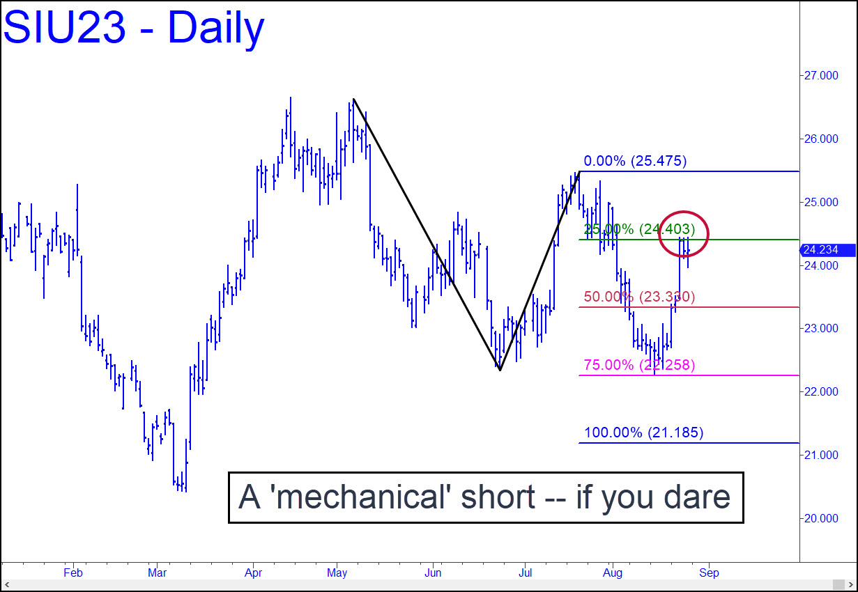 September Silver became a ‘mechanical’ short in theory with last week’s run-up to the green line (x=24.403), but it looked too revved up as the week ended for the trade to be enticing. My gut feeling is that the futures will hit the red line (p=23.33) first, even if they eventually stop out the short, but we’ll look for low-risk opportunities to test this theory rather than trade with a bias. If bears lose this round, that could signal a run-up to as high as 28.48 over the next 5-7 weeks (daily, A= 20.42 o 3-10).