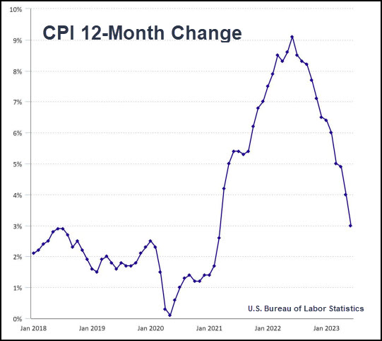 [The following was sent out to clients in late July by my friend Doug Behnfield, a wealth manager and senior vice president at Morgan Stanley Wealth Management in Boulder, CO. Long-time followers of Rick’s Picks will be familiar with Doug’s work, since his thoughts have appeared here many times. I have always considered him not only one of the smartest investors I know, but also one of the smartest guys. I am grateful to him for allowing me to share the insightful report with you. RA] On July 12, the Bureau of Labor Statistics reported that the Consumer Price Index (CPI) for the 12 months ending in June came in at 3% inflation. This annualized inflation rate represents a drop from 9.1% in June of last year, which was the peak in this cycle. The interest rate on long-term bonds correlates very closely with CPI, so it is unusual that bond yields have not followed inflation down in a meaningful way so far.