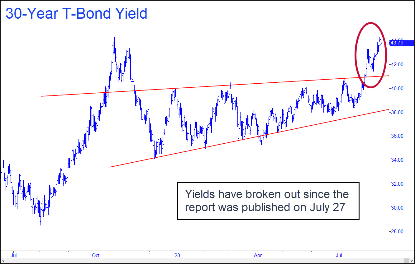 [Editor’s note: At this point the report displayed a chart showing bond yields increasing into late October and then going sideways. However, just after the report went out in late July, yields exploded upward in a manner unforeseen herein. Here is a chart that shows this. If it has changed Doug’s outloook, we will share his thoughts with you at a later date.] One contributing factor to this sideways action is that long-term bond yields also correlate very closely with the Fed’s interest rate policy and the Fed has continually raised the Fed Funds (overnight) Rate since inflation peaked last summer. In June 2022, the Fed was still at 1.5% on Fed Funds, but since then they have hiked rates by 4%. The Fed has also hiked rates by 2.25% since October, even as long bond rates have declined from 4.4% to 3.9% currently. Clearly, Fed rate policy is driven by factors other than current inflation readings.