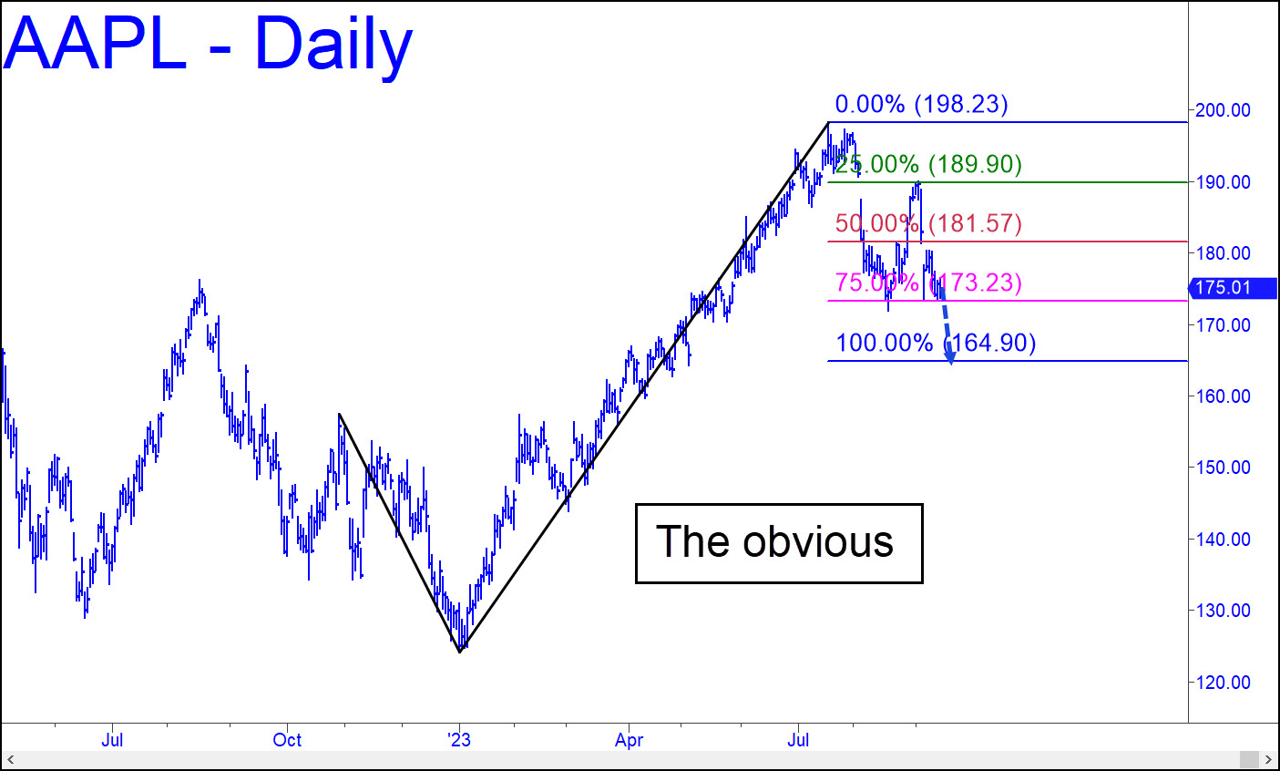 AAPL’s big bounce in August may have added tens of billions of dollars to the macro ledger for a short while, but September’s symmetrical decline has taken it all back. The stock still appears bound for D=164.90 of the pattern shown, equating to a 17% decline from the 198.23 high recorded in early July. Since Apple shares have been an infallible bellwether for the stock market as a whole, we’ll want to pay close attention to price action when 164.90 is hit, which it eventually will be. If the Hidden Pivot support is decisively exceeded, it would imply more downside is possible to as low as 146.25, a Hidden Pivot support derived from shifting ‘A’ up to last August’s 176.15 peak.