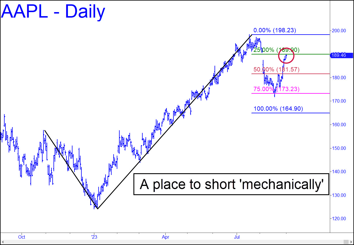 Officially we are short from near 189.90 via the purchase of four Sep 8 180 puts for 0.12. This is a ‘mechanical’ trade, and although the green line (x=189.90) is neither a target nor a resistance, it is where most trades of this kind are signaled. The fact that the rally topped two cents from the target is mere coincidence, even if it may have felt like we got the trade exactly right. If time erodes our puts to the vanishing point by mid-week, we may try again. Regardless, you should be offering half of the puts to close for twice what you paid for them. _______ UPDATE (Sep 6, 2:40 p.m.): Today’s so-far quadrupling-or-better of AAPL 180 puts extends a Rick’s Picks winning streak that stretches back beyond memory for option trades posted either as touts or as spontaneous ‘berries’ in the chat room. Anyone who bought the puts for 0.09 to 0.12 on last week’s guidance should be out of half to three quarters of the position by now. Save a few for Friday, since the explosion of these still-out-of-the-money options has spooked the clowns who are short them. Even if they did so as part of a hedge, they would still be in trouble due to the deadly negative-gamma exposure of options that only yesterday were $10 out of the money. Here’s the chart, so lovely and gratifying. _______ UPDATE (Sep 7, 2:16 p.m.): Nailing the 189.90 top of AAPL’s hellish plunge within two pennies, and timing it nearly perfectly, produced quick gains of as much as 10,000 percent on puts that could have been acquired for as little as 0.06 just a couple of days ago. They traded as high as $6.60 today in panic selling that deepened the already-punitive losses from a day earlier. Many subscribers apparently paid no more than 0.12 for the puts, based on my explicit recommendation to buy them for that price last week. Done by-the-book, the trade would have yielded a mere 5000% gain, or 50 times their purchase price, at today’s lows. As always, I advised exiting half of the position at twice the purchase price — 0.24 in this case. This is how we zero-out the risk of speculative trades like this one before scaling out more puts as AAPL fell. But I also advised keeping a few until the options expire tomorrow, meaning some subscribers are likely still sitting on unrealized, windfall gains. Even stragglers who paid as much as 0.40 or 0.50 for the puts had little trouble multiplying their stake eight- or ten-fold overnight. The trade has extended an options winning streak as far back as any subscriber seems able to recall. One in July was another ‘jackpot’-type bet using AAPL calls that produced a $14,400 profit for a subscriber in a little more than 20 minutes. If you are new to Rick’s Picks, stick around, because there are going to be more of these opportunities. Exploiting the enormous leverage offered by soon-to-expire, out-of-the-money options is one of our specialties, along with laser-precise targeting of price reversals in futures contracts.
