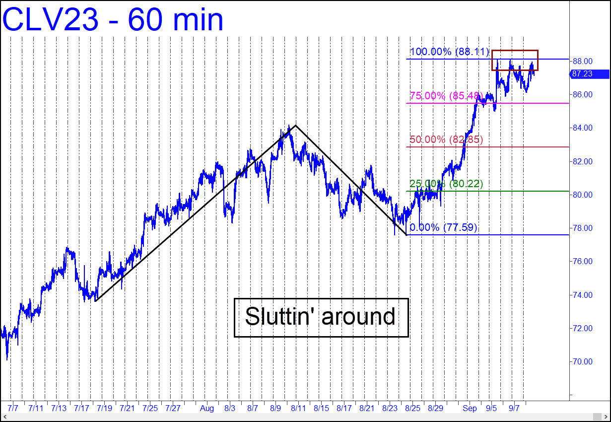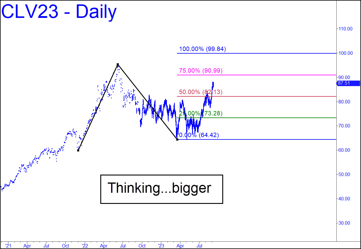 Crude spent the week head-butting the 88.11 target shown. I’m not a big believer in rallies driven by artificial constraints on supply, but our enemies have shown enough persistence and cohesiveness to suggest they can hurt America economically. Pump price are pushing above $4 for regular gas, amounting to another stab in the eye for Wall Street shills who as recently as two weeks ago were talking about, not a soft landing, but about no landing. So much for bullish spin, even if Americans seem to have an inexhaustible supply of surplus dollars to foot the bill for rising energy costs that will push up prices for nearly everything Above 88.11, this pattern, with a 98.84 target will be well in play.