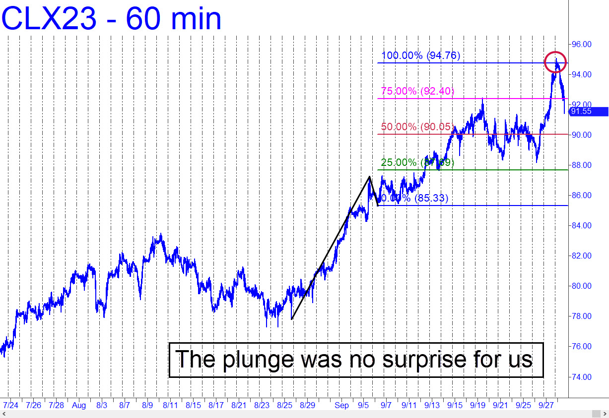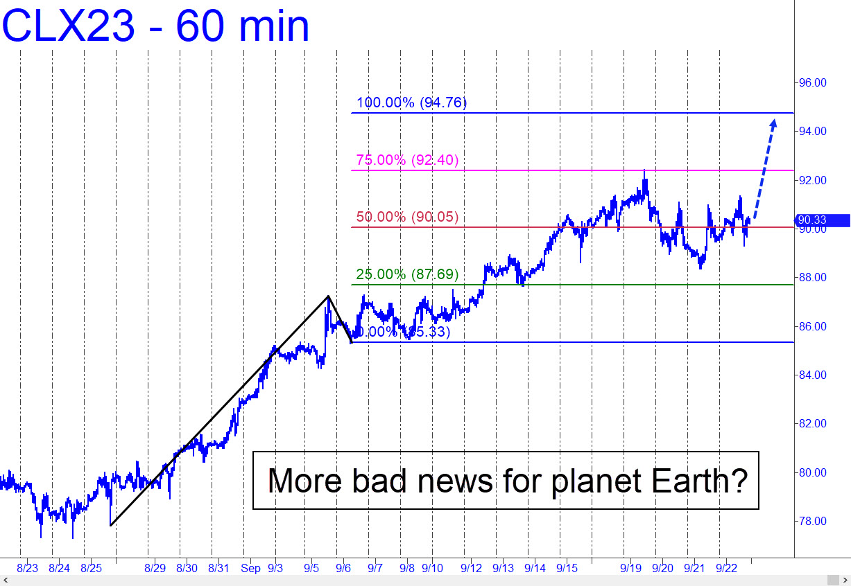Crude turned sluggish last week, but not before generating a bullish impulse leg on Friday that will likely hold positive consequences for the near term. I say ‘positive’ while acknowledging that another turn of the screw could send the world’s fragile economy into a tailspin. Pump prices are already above $4/gallon and will become headline news when it looks as though $5 is coming. To get in step with that eventuality, I’ve lowered the point ‘A’ low of the chart we’ve been using to produce a somewhat higher target at 94.76. A swoon to the green line (x=87.69) would generate an attractive ‘mechanical’ buy signal, but we’ll wait until it is close to happening before we hatch a strategy to trade it. _______ UPDATE (Sep 28, 1:54 p.m. EDT): November Crude has plunged after topping a hair from the 94.76 target billboarded in the current tout. This adds to the evidence that The Big Picture may have changed, since the dollar and Treasury rates have also reversed sharply after achieving important Hidden Pivot targets precisely.