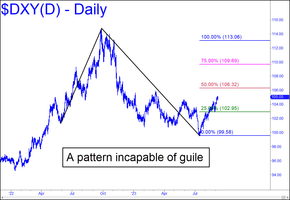 The bullish pattern shown looks incapable of guile, so we don’t have to stick out our necks very far to heap opprobrium on those who can’t stop obsessing over ‘inflation’ and a dollar supposedly headed into BRIC-induced oblivion. As I will continue to point out, the last thing the world needs right now is a strong dollar, since it would increase the burden of debt for all who owe dollars. That is reason enough for DXY to keep on rising, since the mounting troubles of borrowers in and of itself will continue to exert mild short-squeeze pressure on the buck. Accordingly, we should expect the rally to continue to at least p=106.32 over the near term. When DXY pops thought that Hidden Pivot resistance, presumably headed for D=113.06, we’ll see some erstwhile dollar bears start to break ranks. Recession will be full upon us by then, even if unheralded by mainstream news sources.