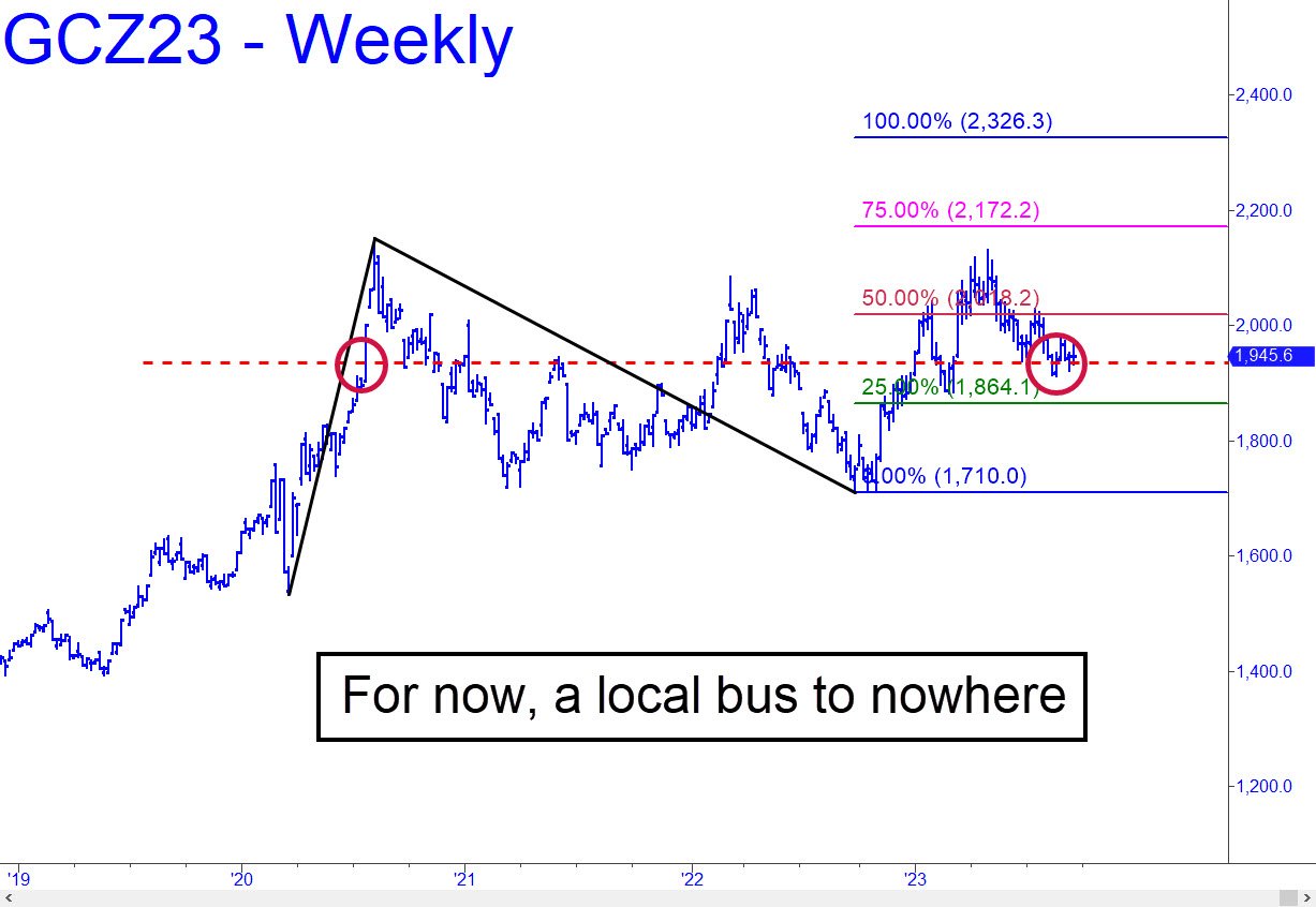 I’ve reproduced a chart that goes back to 2019 in order to show clearly that there has been little drama in more than three years. Comex futures are trading about where they were in the summer of 2020, meaning there has been no net gain since then. The chart is unmistakably bullish and projects to as high as 2326.30 (basis the August contract), but that doesn’t mean gold couldn’t fall by $200 or more before it heads into, if not the wild blue yonder, then perhaps toward a towering cumulus cloud on the horizon. A pullback to x=1864.10 in the meantime would trigger a ‘mechanical’ buy with excellent odds for success, but we’ll wait until it gets there before we discuss entry tactics.