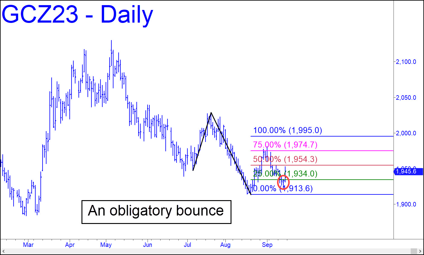 Gold is in an obligatory bounce from the green line (x=1934.00), and any long positions initiated there would be showing a paper profit of around $4400 on four contracts. The futures would need to hit p=1954.30 to signal a partial exit, but bulls looked sufficiently energized to accomplish this when trading resumes Sunday evening. I have my doubts that the run-up will reach D=1995.00, though, in part because the turn from the recent low looked too agonized. Regardless, 1995.00 is theoretically in play and would become an even better bet if the rally impales the midpoint Hidden Pivot on first contact. _______ UPDATE (Sep 18, 9:17 p.m.): The textbook ‘mechanical’ buy that triggered a week ago at x=1934.00 has gone on to produce an $8000 gain for anyone who did the trade. It is time to realize half of your profits now, since the futures this evening have touched the red line (p=1954.30) as anticipated. Here’s the chart. _______ UPDATE (Sep 20, 8:20 p.m.): The vicious bull-trap stab this morning to 1069 was short-lived, but it gave anyone still long an opportunity to exit with an additional $1800 for each contract still held. If you kept 25% of the original position for a swing at the fence, I’d suggest an ‘impulsive’ stop-loss at 1943.70 for now.