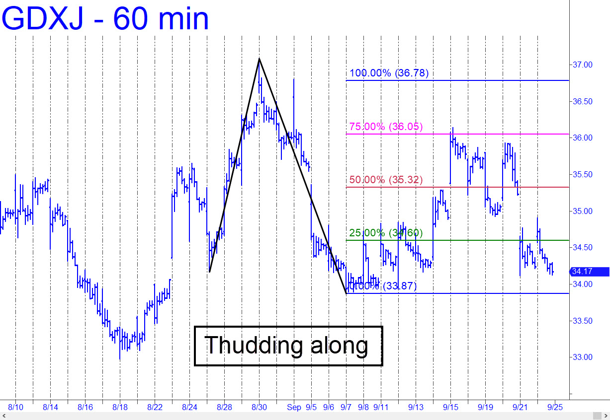 We’re long 400 shares from a ‘mechanical’ buy at the green line (x=34.60). Friday’s bull-trap rally on the opening bar strongly implies GDXJ will take out at least another low or two before it can get traction. So that we don’t get caught like everyone else in a stressful second-guessing game, I’ll suggest sticking with the 34.11 stop-loss I posted in the chat room on Thursday. My hunch is that a more tradeable low will occur near 33.21 (60-min, A=36.80 on 9/1). We can try again to get long there rather than suffering-and-shuffling along with the herd in the meantime. _______ UPDATE (Sep 25, 10:04 p.m.): Today’s nasty dive stopped out the trade for a loss of about $200. This is a sign of rotten health, considering the textbook appeal of the pattern we used to get long ‘mechanically,’
