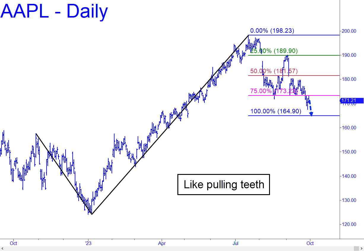 Although AAPL’s fall to the 164.90 target (see inset) was all but ordained two months ago when hard selling crashed the midpoint support at 181.57, the stock’s handlers have made it an ordeal for bears to profit easily. Shorting ‘mechanically’ on the squeeze up to 189.90 worked well, and I expect bottom-fishing at 164.90 to be a money-maker too, since the pattern is not very obvious. The rally would have the potential to hit 182, but I’ll suggest using a trigger interval of $1.50 to get long. If you are unsure about how to do this, ask in the chat room for guidance when appropriate.