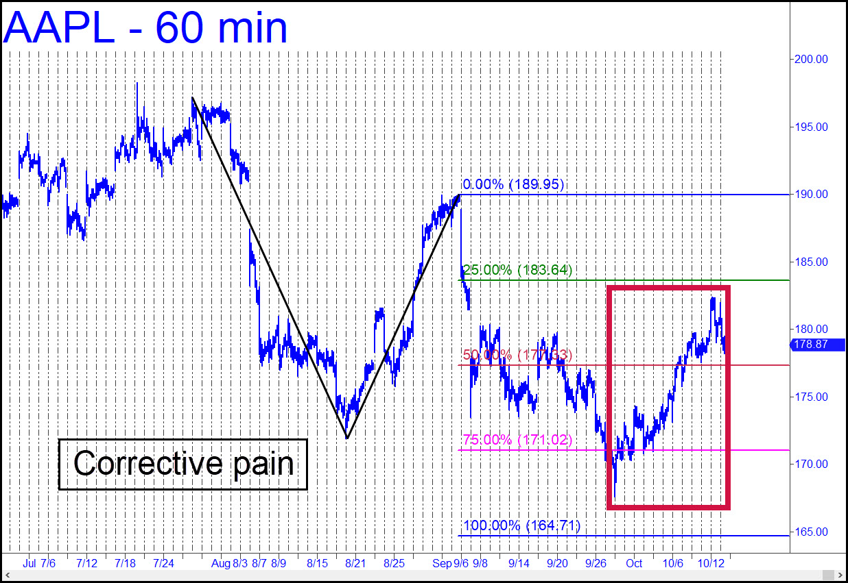 I’ve altered the picture somewhat to produce an uglier but still logical downside target at 146.25. That’s $38 below the one at 164.90 given here previously, and there is compelling clarity to support it, including the precise bounce from the red line, p=172.24. The pattern has already produced a $13 winner from a ‘mechanical’ short at the green line and would likely produce another if this remarkably vicious short-squeeze can get there. I say ‘remarkably’ because AAPL swam perversely against the tide for most of last week. Stay tuned to the chat room and your email ‘Notifications’ for tradeable guidance, keeping the 100-bagger from puts bought a few weeks ago in mind.