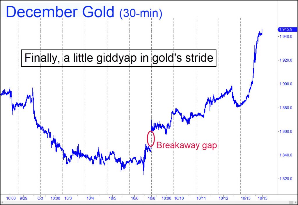 Recall that after the war erupted on Saturday, October 7, with an assault on Israel by Hamas, the markets seemed relatively subdued when trading resumed Sunday night. We can attribute this seemingly absurd behavior to the deft touch of the dirtballs who manipulate stocks, bonds and commodity prices for a living. They are very smart guys, especially in dire circumstances. And even if they weren’t able to keep a lid on bullion prices for long, they didn’t panic into Treasurys, at least not yet, and they gave stocks the temporary appearance of buoyancy. Accomplishing this last trick was easy for reasons I’ve explained here many times: Squeeze shorts in just one stock — AAPL — and you can scare off a pitchfork mob of sellers who might otherwise incline toward burying the broad averages. In this way, the dirtballs were able to distribute stocks for just a little longer. But they will not be able to surf the avalanche that is coming this week. If index futures open quietly on Sunday night, don’t be fooled. In the investment world, as the old saying goes, he who panics first, panics best.