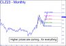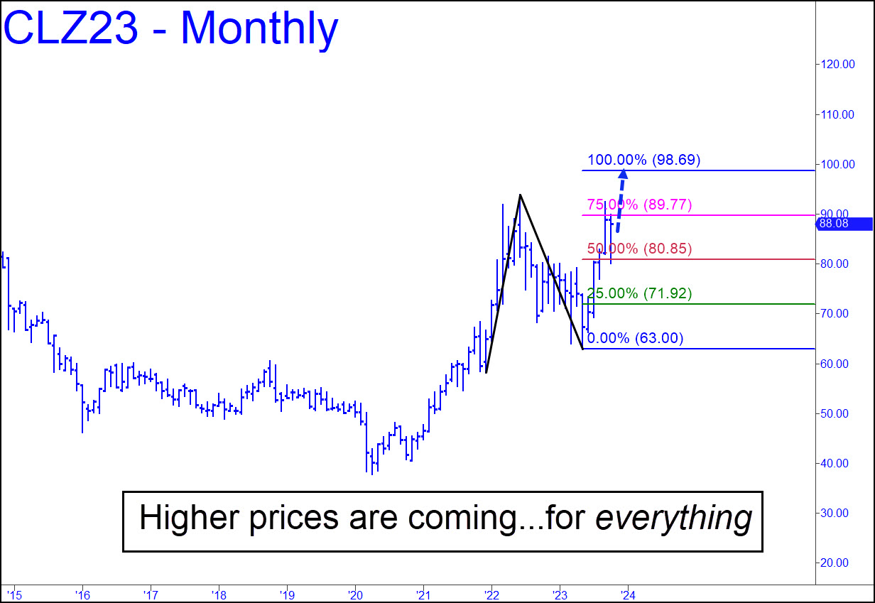 We’ve been using a 117 target to discount the horrific geopolitical climate, but for trading purposes let’s focus on the 98.69 target of the pattern shown. It is affirmed by September’s powerful thrust past the 80.85 midpoint resistance, but also by the difficulty crude has presented for anyone wanting to get long, even by way of last week’s all-too-fleeting dip to a ‘mechanical’ buying trigger at p=80.85. Gasoline prices dipped as well, but they will be headed higher soon if December Crude is in fact on its way to at least 98.69.