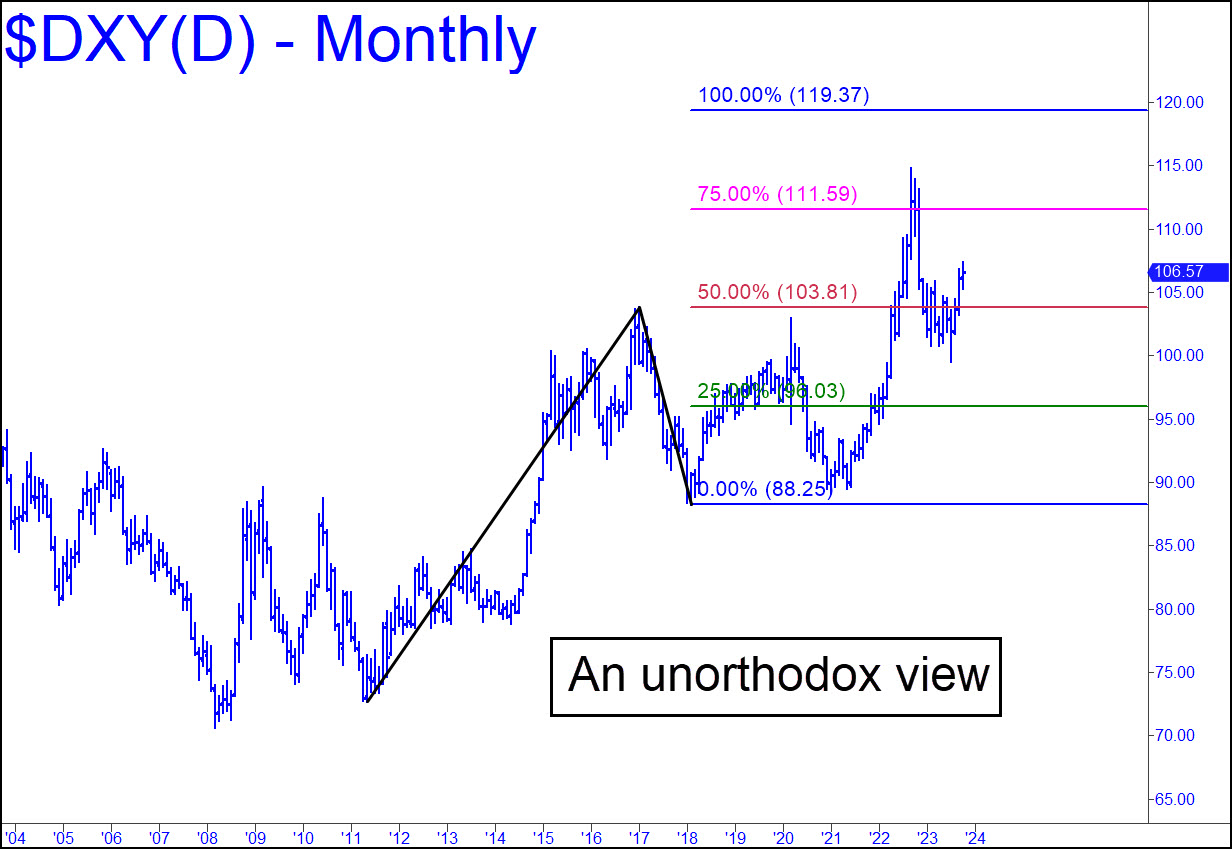 The monthly chart shown offers an unorthodox view that should be held in mind as the dollar makes its way higher. Much higher. Last week I presented a weekly chart that went back to 2019 with a 124.72 target. This one stretches back to 2004 and has a somewhat less ambitious ‘D’ target at 119.37. I’ll suggest sticking with the earlier version to get a precise handle on trend strength in the weeks ahead. Specifically, you should use its 112.16 midpoint resistance as a minimum upside projection for the next six to eight weeks. However, in the highly unlikely event of a vicious swoon to the green line of this monthly chart (x= 96.03) , you’ll be able to recognize it for what it is: just a correction.