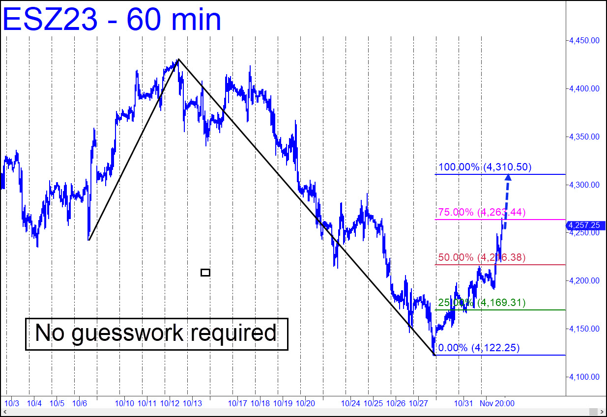 With the Middle East war threatening to escalate on Friday, it’s odd that sellers couldn’t deliver a knockout punch. They spent the entire session running the futures up and down within a 20-point range, turning what should have been a rout into a merely moderate decline. Not only did they fail to bury the broad averages, bears couldn’t even reach the first of two downside targets in the E-Mini S&P futures at 4100.00. The second lies at 4o68.50, and it seems likely to be reached by Tuesday if not sooner. We won’t necessarily attempt bottom-fishing because corrective rallies have been pretty anemic lately. ______ UPDATE (Nov 1, 4:08 p.m.): Anemic price action has mutated into a full-blown short squeeze, investors either havinginginging grown bored with the pace of Israel’s invasion of Gaza or completely forgotten about it. For now, use the 4310.50 target of this pattern as a minimum upside objective.