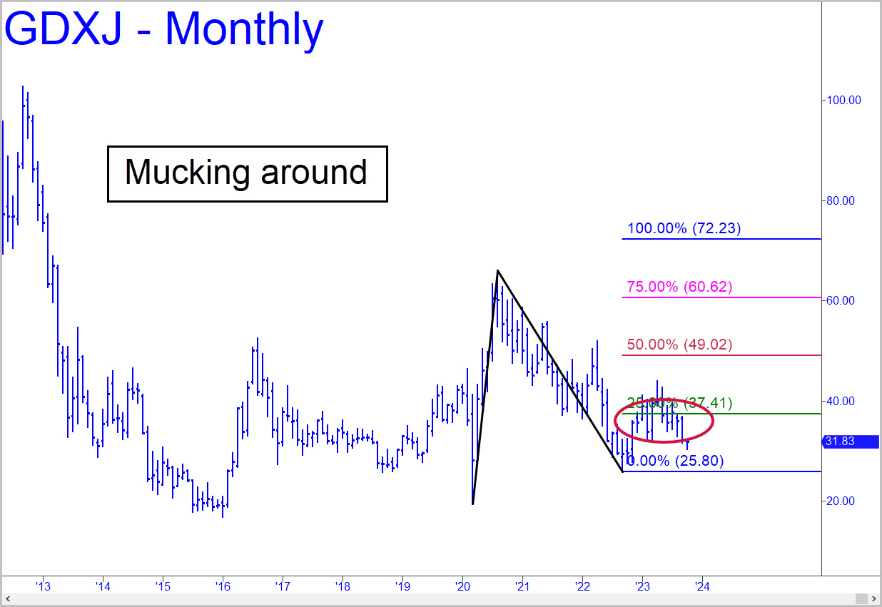 The monthly chart offers a sobering perspective on what it would take to put GDXJ back on the bullish track it rode to $66 in 2020. This gold vehicle has been mucking around in no man’s land ever since it tripped a theoretical buy signal at x=37.41 in 2014. The 49.02 midpoint Hidden Pivot will be a crucial threshold, but it lies 54% above, so there’s no point in thinking about it now. A more realistic number is 33.79, a tick above a small but technically significant look-to-the-left ‘external’ peak recorded on September 25.