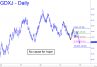 GDXJ was headed higher when the week ended, but the chart suggests this was no reason to celebrate. Although a strong rally to the green line would set up an appealing ‘mechanical’ short, I doubt it will get there. That means we could try to squeeze off the short at the red line, a type of trade we don’t do that often. The stop-loss would be at 34.87, calculated by taking a third of what we stand to gain if this vehicle eventually drops to D= 30.36. Eagle-eyed Pivoteers might notice that the impulse leg is not strictly kosher, since the would-be ‘external’ low at 34.04 recorded on March 16 is in the shadow of June 29’s 33.95 low.