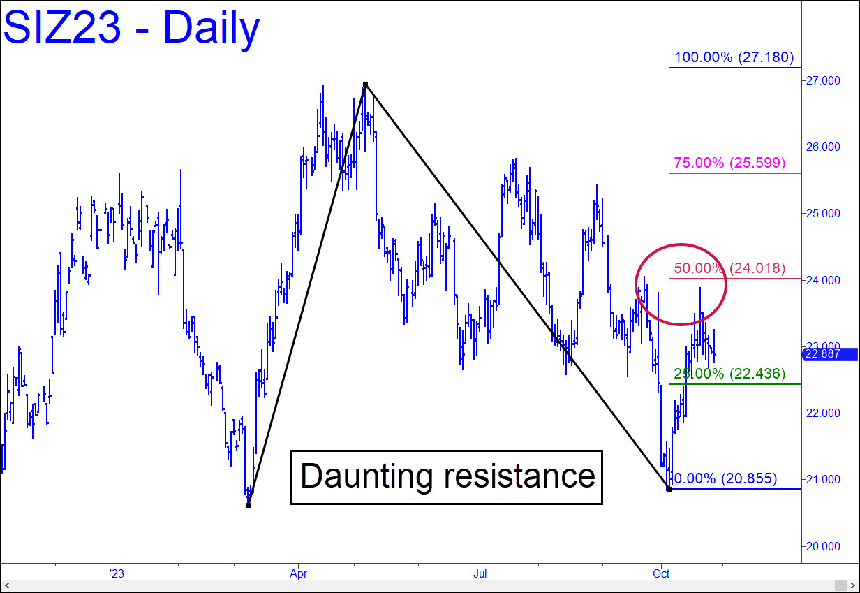 The spike that capped the recent rally narrowly failed to surpass an ‘external’ peak at 24.05 recorded a month earlier. It was not all we might have hoped for. But there was more resistance than appeared, including a second, very sharp peak that caught bulls off guard before crushing them in a two-day cascade. Now, looking on the bright side, with gold promising to drag silver higher, we should expect this pullback to give way to an exuberant thrust that clears not just the prior peaks, but also a midpoint Hidden Pivot resistance at 24.02. Once the December contract is above them, we’ll be able to trade ’em up as bulls cruise to at least p2=25.60.