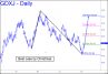 Inspired by gold’s ballistic move on Friday, I’ve used an ambitious reverse pattern to project a 42.09 rally target. It is clear and compelling, implying it will work not just for getting trend and targets precisely right, but enabling some profitable trades along the way. The red line (p=36.28) should produce a stall, possibly tradeable, since it closely coincides with a ‘voodoo’ resistance. Still less uncertain is that GDXJ will achieve the midline, a 7% move from here.