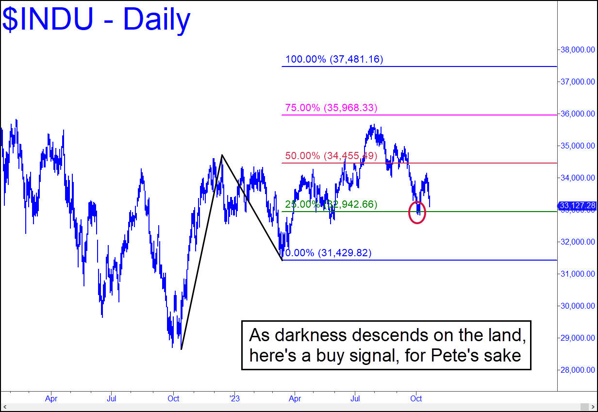 We should never discount this possibility, as the chart reminds us. What it says, in coldly disinterested technical terms, is that the Dow Industrials became a theoretically enticing buy when, with dubious prescience, they bottomed on the green line just hours before the Hamas attack. Under the simple rules of the Hidden Pivot System, this triggered a ‘mechanical’ signal to get long. Although this doesn’t’t necessarily mean we should expect the Indoos to rocket to new all-time highs, it does portend a rally to at least the red line (34,455) before DJIA relapses to beneath C=31,428. This bullish set-up usually works, so don’t be surprised if a preternaturally powerful rally develops amidst growing darkness in the real world.
