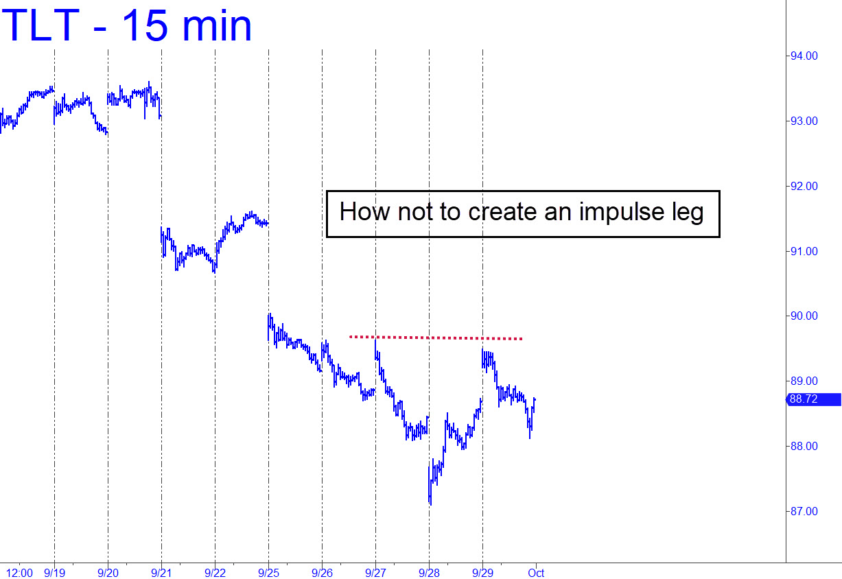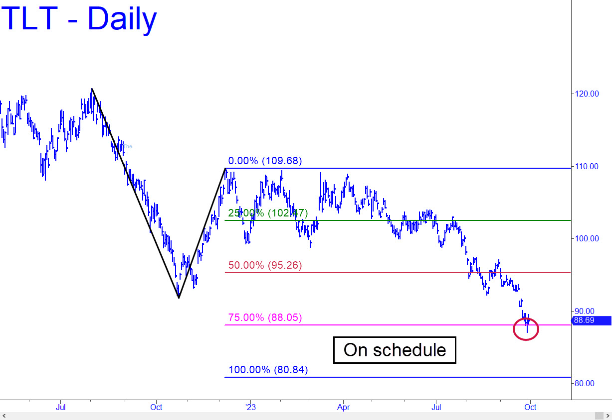 TLT has turned higher because it is synched with a 4.81% target for the Long Bond that was precisely achieved last week. However, there is room for another leg up, to 4.98%, and therefore room for TLT to fall commensurately to the 80.84 target shown in the chart. TLT’s rally should be tradeable nonetheless, and some subscribers have jumped on call options suggested by ‘Spartacus’ in the chat room. Implied volatilities are running at least a third higher than historical, so the bet will face some headwinds no matter what happens. It is not encouraging that the rally from Thursday’s 87.10 bottom, steep though it was, could not push impulsively past last Wednesday’s 89.62 ‘external’ peak. Here’s the chart.