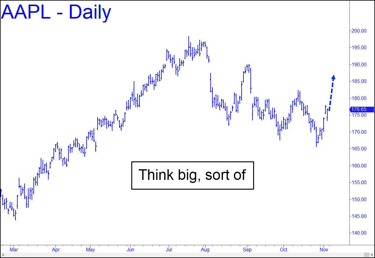 The stock’s handlers, undisputed geniuses of the Einsteinian buy-and-hold strategy, did so well keeping AAPL aloft last week that we should assume they can keep this short squeeze going for at least another week or two. They did after all trick investors into stupidly shrugging off the implosion of iPhone sales in China, a remarkable obfuscation that demands our respect. Accordingly, I’ll suggest using a voodoo number at 186 as our minimum upside target for the next two weeks. The stock will first need to fake its way above the 182.34 ‘external’ peak recorded on October 12, but that is hardly an insurmountable problem for world-class thimble-riggers who have mastered the art of producing volumeless leaps whenever they need a big rally and there are few actual buyers around.