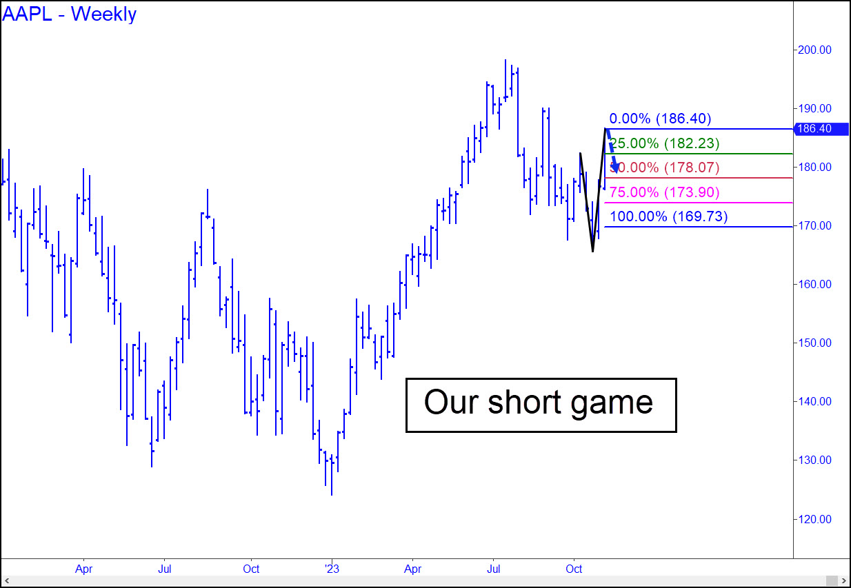 AAPL was rising steeply as the week ended, but I’ve gone out on a limb with a chart that dwells on bearish possibilities just ahead. Unlike MSFT, whose vertical rally left it at new record-highs, AAPL would need to push past two daunting ‘external’ peaks to get there. AAPL’s closing high also equaled a voodoo number that would make a logical spot for a correction to start. It would trigger a short at 182.23, assuming the stock does not take out last week’s 186.40 high first. Thereupon, p=178.07 would be our minimum downside objective, where half of any shorts, including with options, would be covered. _______ UPDATE (Nov 14, 7:57 p.m.): A new high at 188.11 has raised the trigger on the short to 183.94, with half to be covered at p=179.78.