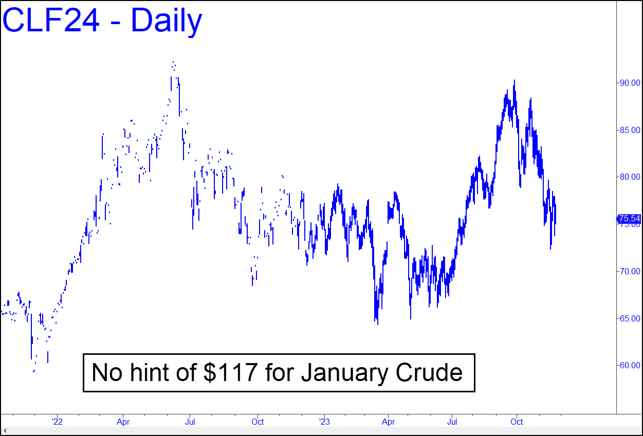I’m ready to bury that earlier prediction of $117 a barrel, since the daily chart has evolved to provide no hint of it. Not that it couldn’t happen. There is an ABCD pattern stretching back to 2021 that would allow for a move to above $115. The original forecast assumed that a growing conflagration in the Middle East would drive the price surge. However, it turns out that speculation, including by the U.S. military brass, that Israel would face a long, drawn-out war, turned out to have been based on Israeli disinformation. In fact, Hamas has trapped itself in a tunnel die-off, every shaft, entrance and exit of their supposed fortress having been mapped by Israel at the time they were created. As for Hezbollah opening up a new front to the north, they haven’t, and one can only surmise that neither they nor their paymasters in Iran want to cause the total destruction of Lebanon — or of Iran’s nascent A-bomb capability, since a couple of bunker buster boms such as Israel used on Gaza City could end the weapons program in a trice. Returning to January Crude’s chart, it is a mess of dueling impulse legs that are tradeable, but only with diligent attention to the intraday bars. At the moment, the chart is neither bullish nor bearish, nor are there any price targets of interest that I can discern.