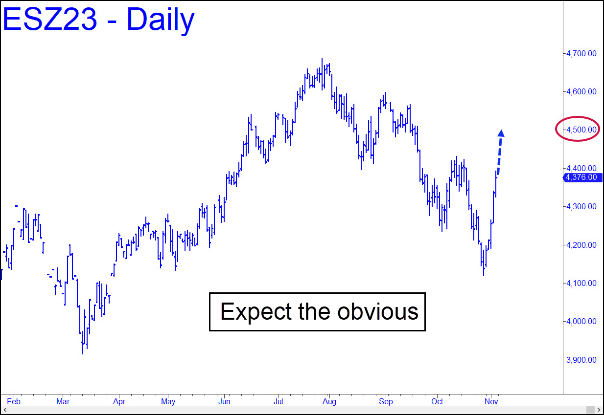 DaBoyz demonstrated with last week’s unrelenting short squeeze that they mean business. It was made possible by nervous anticipation of a global war starting in the Middle East. Although this remains an all-too-real possibility, it is exactly the kind of thing Wall Street loves to ignore: a potentially world-ending wall of worry that features a billowing mushroom cloud. For purposes of predicting the extent of this wack-o rally, I see no Hidden Pivot patterns as useful as the round number 4500. That’s where this hoax is headed, and because it lies within less than two points of a voodoo number, we might look forward to getting short up there. Trading with the trend in the meantime is bound to be challenging, since everyone else will be trying to do it, too. I am not yet ready to consider the possibility of new all-time highs, but 4500 can serve for the time being as a minimum upside target.