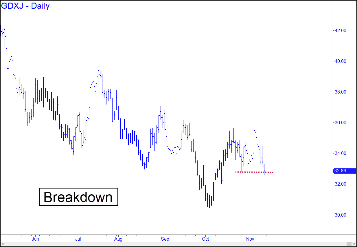The clock ran out on GDXJ when it was in the throes of a snapback rally following a dip beneath two ‘internal’ lows recorded around Halloween. The day ended in a ‘discomfort zone’ bounded by the lows and another at 32.05 from October 12. That makes it tradeable, but not by way of easy instructions that I could proffer a day in advance. However, if you’re proficient at fashioning reverse triggers, you can try a 37-cent trigger interval from any low that falls in the range 32.15-32.44. _______ UPDATE (Nov 14, 8:15 p.m.): GDXJ blasted off with a gap opening, denying us, and nearly everyone else, a chance to get long. That could give the rally a little staying power, although I doubt it will get very far due to the two previous failures to poke above mid-September’s 36.14 high.