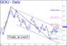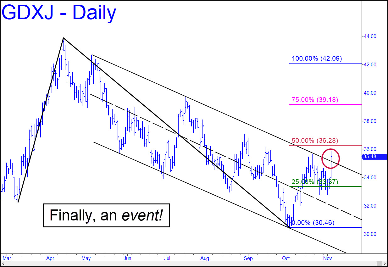 At last! Friday’s heroic leap spiked GDXJ through the upper trendline of a longstanding channel that was featured here last week. Even more encouraging was the close above it, although the rally fell 29 cents shy of an ‘external’ peak at 36.14 recorded on September 15. It will need to be exceeded to create an impulse leg we could trust. Better still would be a move surpassing a second peak of somewhat higher degree at 37.08 from August 30. But any move above the lower peak would allow us to view even significant weakness subsequently as merely corrective.