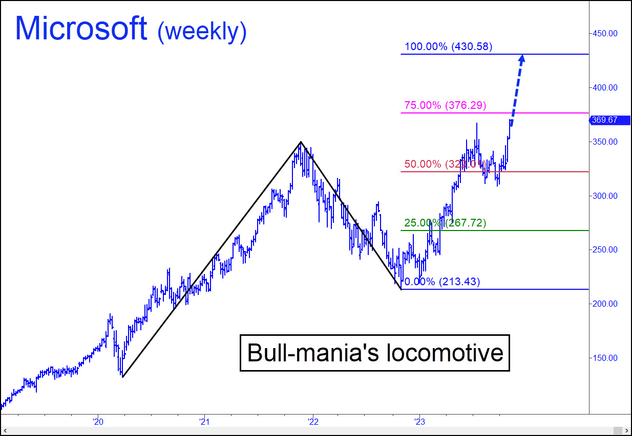 U.S. shares continued to climb a wall of well-justified worry last week, propelled with sufficient vigor to suggest new all-time highs are likely. Notice how Microsoft’s push into record territory on Friday occurred after the stock had spent nearly six months consolidating at the red line. This is a ‘midpoint Hidden Pivot’, according to our proprietary method of analysis, and MSFT’s decisive move above it has freed the stock from its gravitational pull. This is significant, because as long as Microsoft shares are moving higher, the broad average will follow in their vortex.
