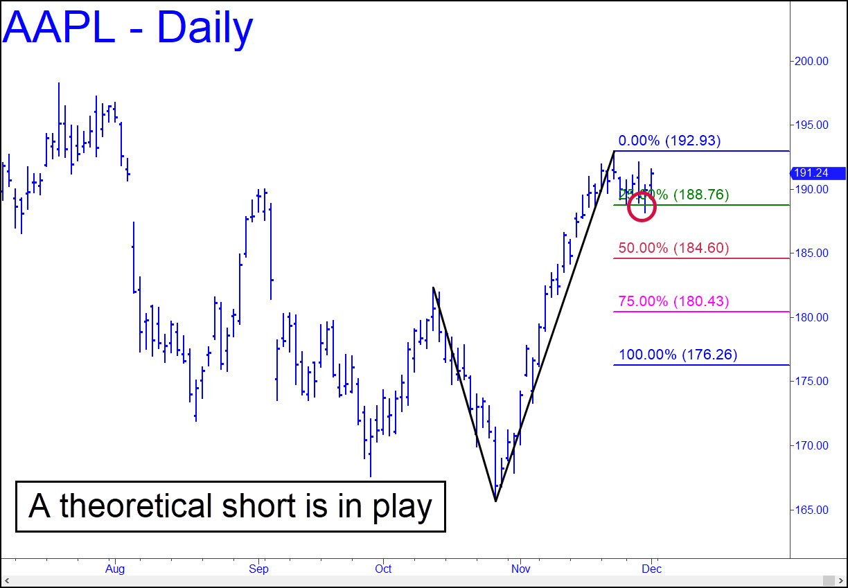 My short-term-bearish outlook is more evolved in AAPL than in the E-Mini S&Ps, since the stock already triggered the prospective short noted in the tout for the latter. The trade would have finished the week $2.48 in the red, but I am not advising getting into it belatedly in any event — at a better price, as it were. It would take but a 1.6% rally to achieve new record-highs, and there is no compelling technical rationale for betting against this. The next attractive buying opportunity based on the chart would come at p=184.60, a midpoint support that we can bottom-fish with an rABC pattern on the 15- or 5-minute chart.