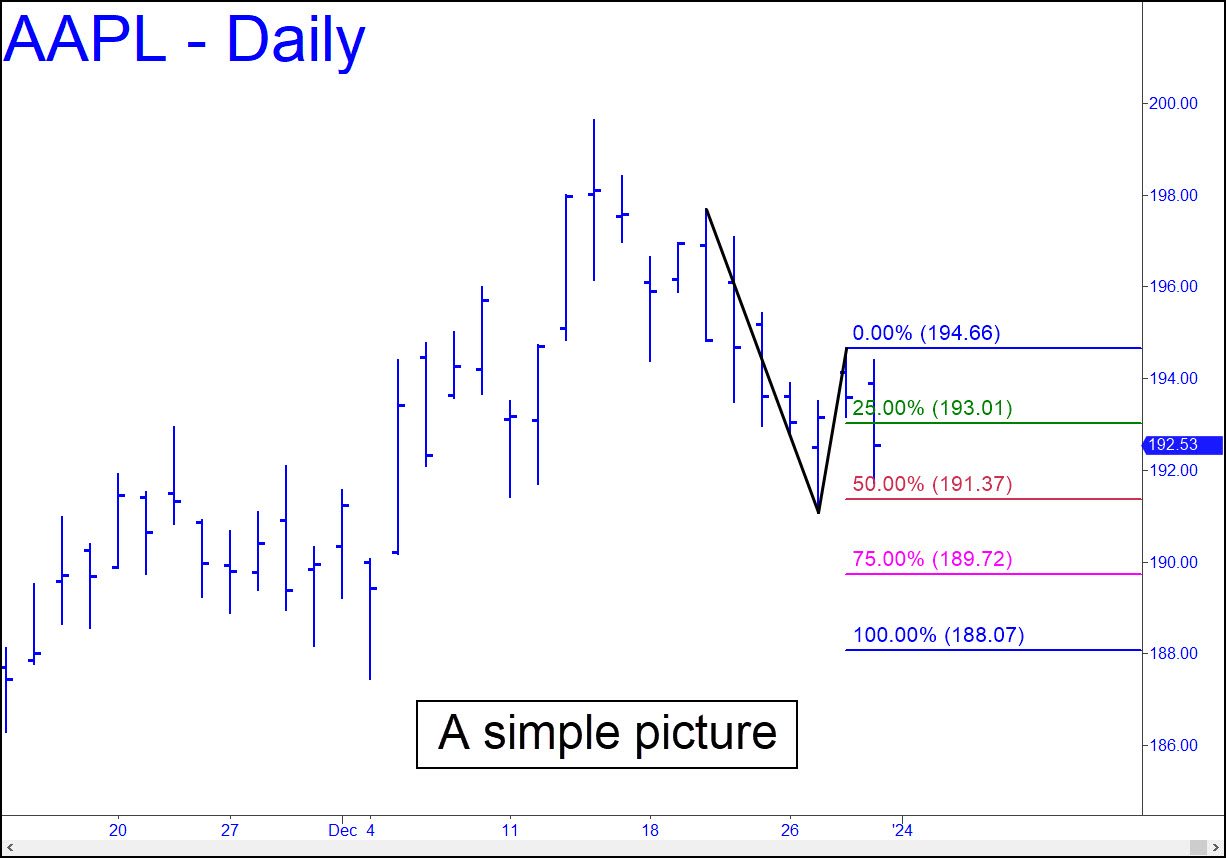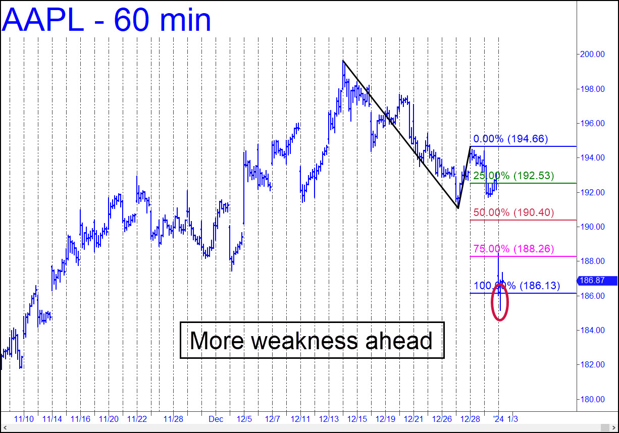 There are numerous conflicting currents acting on AAPL at the moment, but I’ve settled on a corrective pattern on the daily chart that seems clear enough to rely on in the days ahead. A bounce precisely from p=191.37 would help us get oriented, but any decisive breach of this support either intraday or on a closing basis would portend more slippage to as low as D=188.07. We’ll be entering a new year, an event that should have no particular impact on stocks but which often has ignited powerful rallies. In any case, the pattern shown should be easily tradable in all the usual ways, since it began with a ‘textbook’ impulse leg. _______ UPDATE (Jan 2, 12:15 p.m.): This morning’s take-no-prisoners opening shredded every minor ‘D’ target/support on the hourly chart, generating an impulse leg in the process. This implies that any rally that falls short last year’s high at 200 is setting up another leg down.