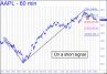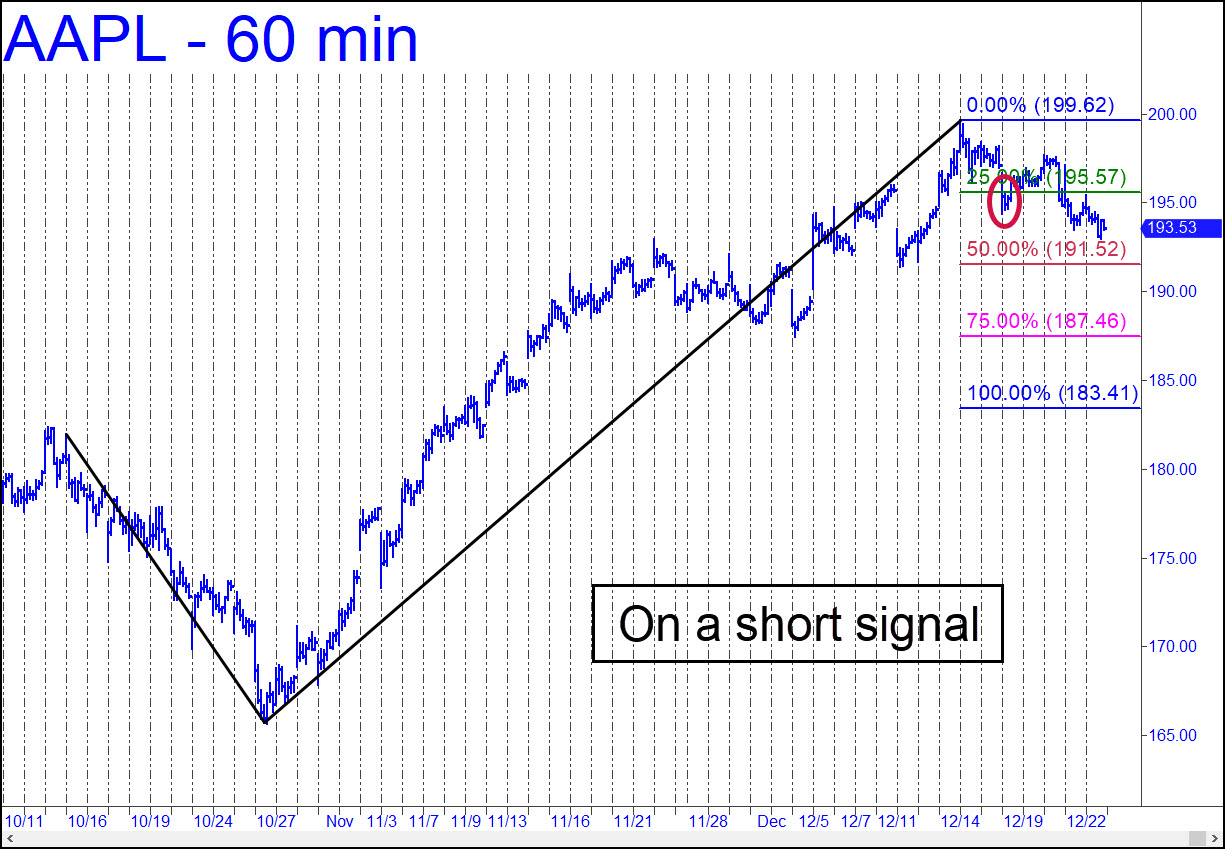 The stock has been on a short signal since it fell $4 to 195.57 to a week ago. There is implied minimum downside to p=191.52 for this presumptive correction, but a decisive breach of this Hidden Pivot support would portend more slippage to at least p2=187.46 or even to D=183.41. Since the broad averages will follow the stock whichever way it goes, we’ll monitor price action at HP levels closely. AAPL has returned to normalcy, more than keeping pace with MSFT in the face of news that would rattle buyers were they not predominantly heedless psychotics and buy-and-hold chimps who purport to ‘manage’ portfolios.