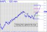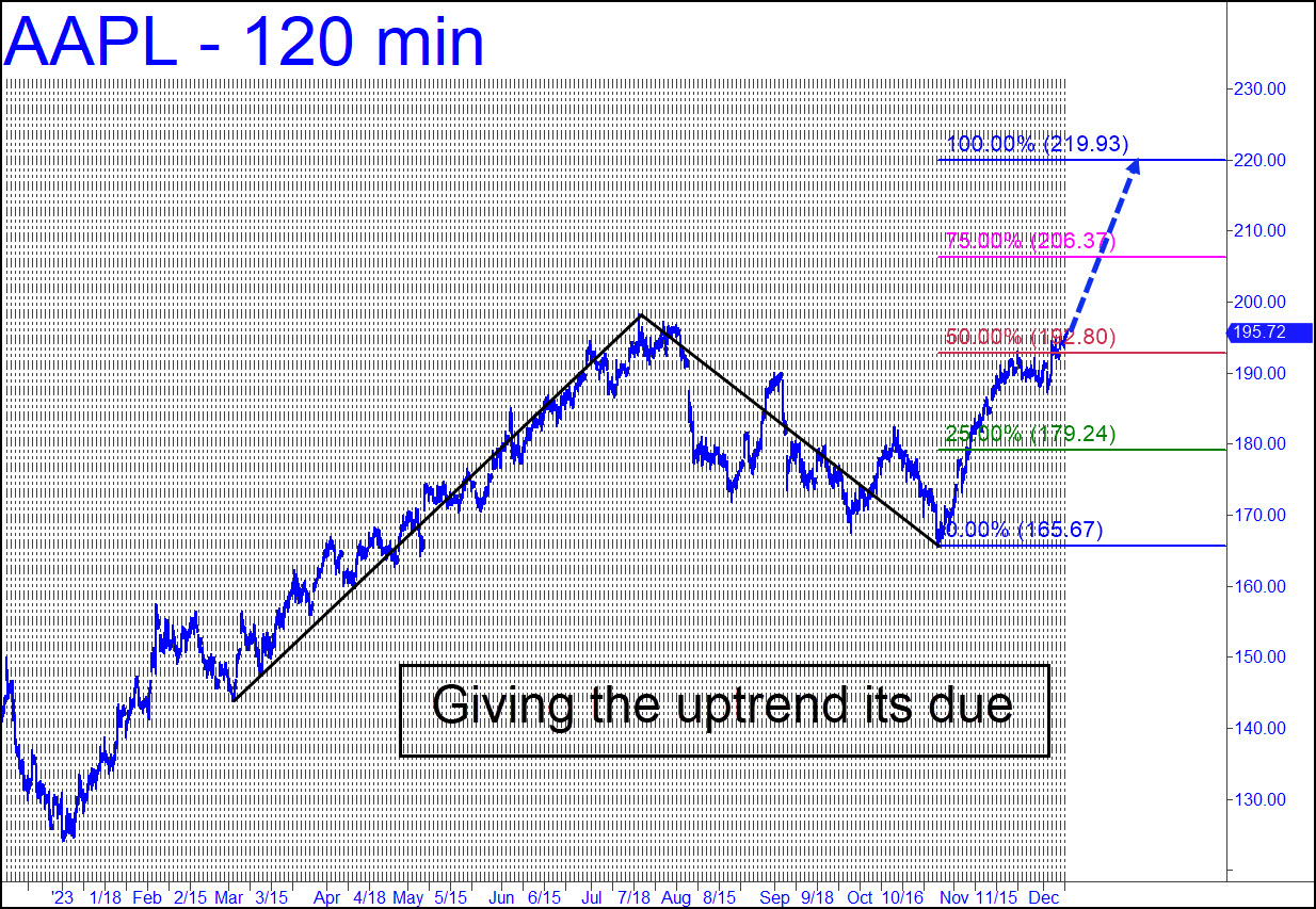 Although AAPL has trailed the meteoric MSFT, the stock could play catch-up with a blast to as high as 219.93, the target shown. It would presumably get there within a day or so of MSFT’s achieving a corresponding target at 430.58 that has been drum-rolled here. A breakaway move this week above p=192.8 would be a tell hinting of buying power sufficient to put a worthy finishing stoke on the stock’s spectacular rise. Any trades will have to come from the intraday charts, since we are unlikely to be gifted with a pullback sufficient to generate a ‘mechanical’ buy on a chart of larger degree. _______ UPDATE (Dec 13, 10:58 p.m.): Are these guys good, or what? AAPL’s handlers have turned murderous tonight, brazenly pushing the stock into record territory in after-hours trading. There isn’t much left to slow it down now.
