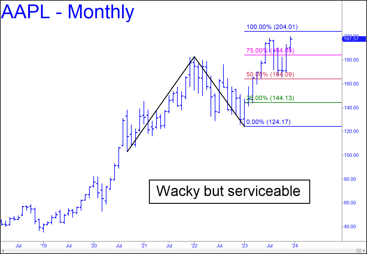 It wasn’t long ago that we were reading about a menacing slowdown of iPhone sales in China, but the news evidently has been forgotten with the stock’s push into new record territory. It has trailed Microsoft for a few good reasons but now appears eager to make up for lost time. Most immediately, that would portend a run-up over the very near term to 204.01, the Hidden Pivot target of the eye-jarring pattern shown in the chart. If bears push past it easily with feverish short-covering in the days ahead, it would bring into play a 253.96 target derived from a lower ‘A’ at 53.15 recorded in March 2020.