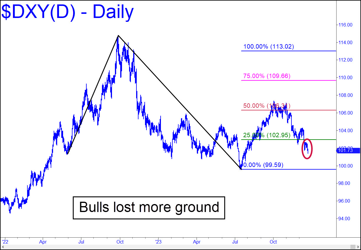 Dollar bulls ceded more ground last week, further thwarting Powell’s efforts to raise the cost of dollars so that they are no longer effectively free to speculators and money-changers. DXY’s moderate slippage left it somewhat shy of wrecking an incipiently bullish pattern via a dip beneath the point ‘C’ low; however, the direction and rate of decline were hardly encouraging. The dollar remains on a ‘mechanical’ buy signal in theory, but the strategy no longer looks likely to produce a winner. If the plunge takes out C=99.59, we should brace for more slippage into the mid 90s.