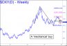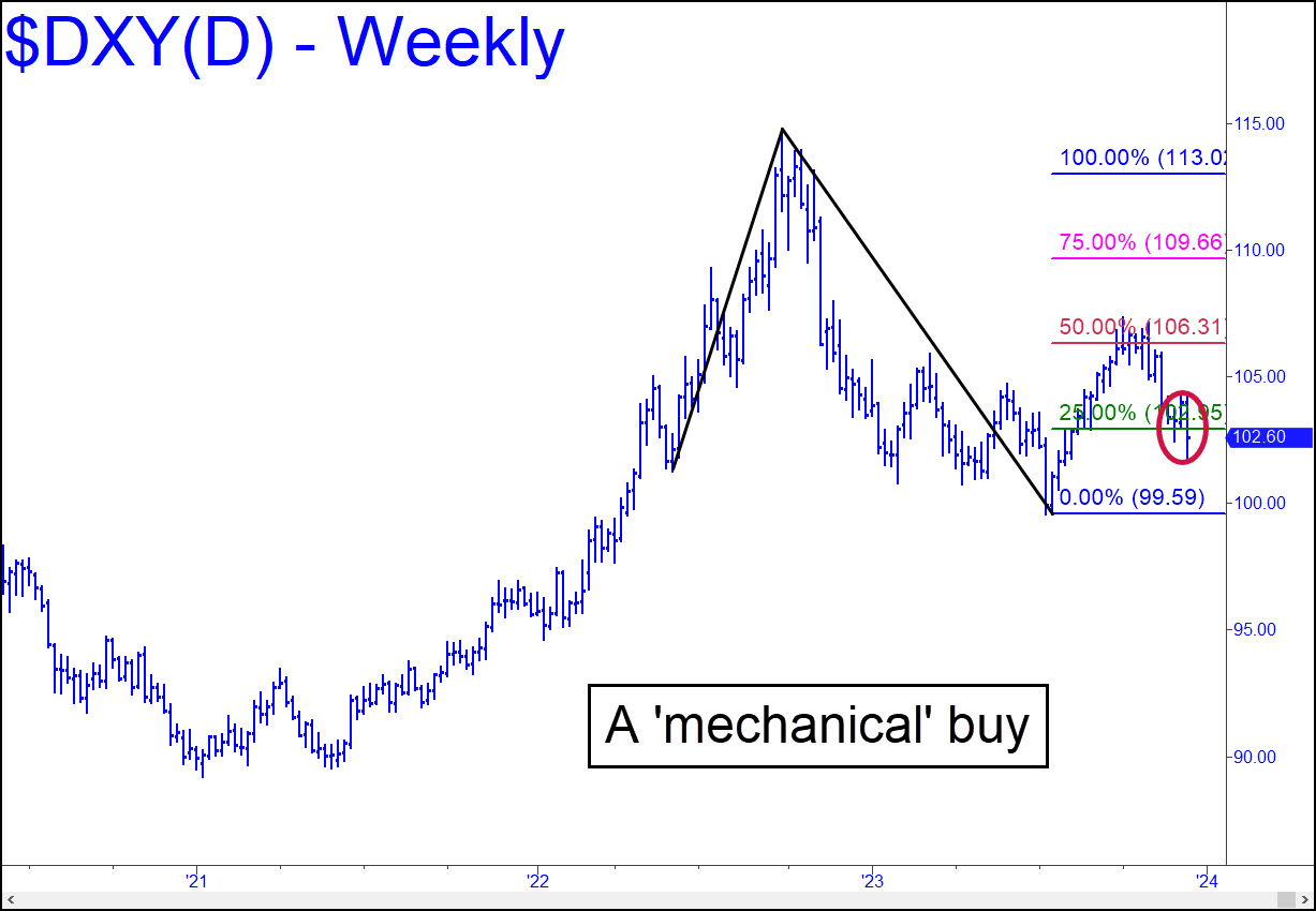 This should be interesting, since the Dollar Index has triggered an appealing ‘mechanical’ buy with its return to the green line earlier this month. A stop-loss at 99.59 would apply, although we won’t be trading on the signal. A sustained rally would end the stock-market rally begun in October, since there is nothing that Wall Street, the banksters and everyone who owes money should fear more than a resurgent dollar. My hunch is that the rally would need to reach p2=109.66 or so before still-dim perceptions of the threat would sharpen. The first to feel the pain would be the growing hoard of motorists whose cars, including a few Bentleys, are slated for repossession. I’m looking for this debtor epiphany to occur simultaneously with MSFT’s fall from a 430.58 bull-market target billboarded here earlier.