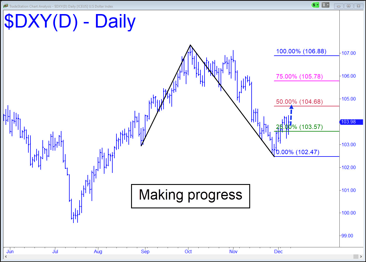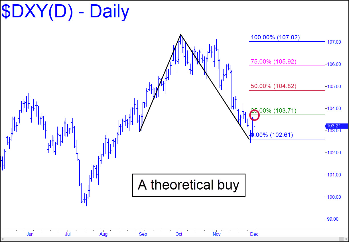 The Dollar Index tripped a theoretical buy signal on Friday when it slightly exceeded the green line (x=103.57) early in the session. A hypothetical trade would have finished in the red, but we’ll await more evidence next week to determine whether the rally has the moxie to reach p=104.82, the midpoint Hidden Pivot resistance. Although we don’t actually trade this vehicle, its gyrations inform and influence our outlook for other vehicles, particularly bonds and bullion. Assuming the latter remains strong, it will be interesting to see whether the dollar and gold/silver are able to rise simultaneously. That would be an important tone change — something we haven’t seen before for a prolonged period of time. _______ UPDATE (Dec 8): Nothing dramatic, but the dollar made encouraging progress last week toward the 104.68 midpoint pivot of the pattern shown in this chart. If it reaches it this week, that would generate the first bullish impulse leg we’ve seen on the daily chart since September. _______ UPDATE (Dec 13, 11:20 p.m.): Nothing cheers the chimps who manage your money like a falling dollar, since a strong one will undo every assumption that has powered global markets and economies (and Globalists!) for as long as anyone can recall. A day of reckoning is coming, so don’t expect the dollar to keep falling just because Wall Street and the bozos who invent the news are spinning everything Powell says these days as wildly dovish.