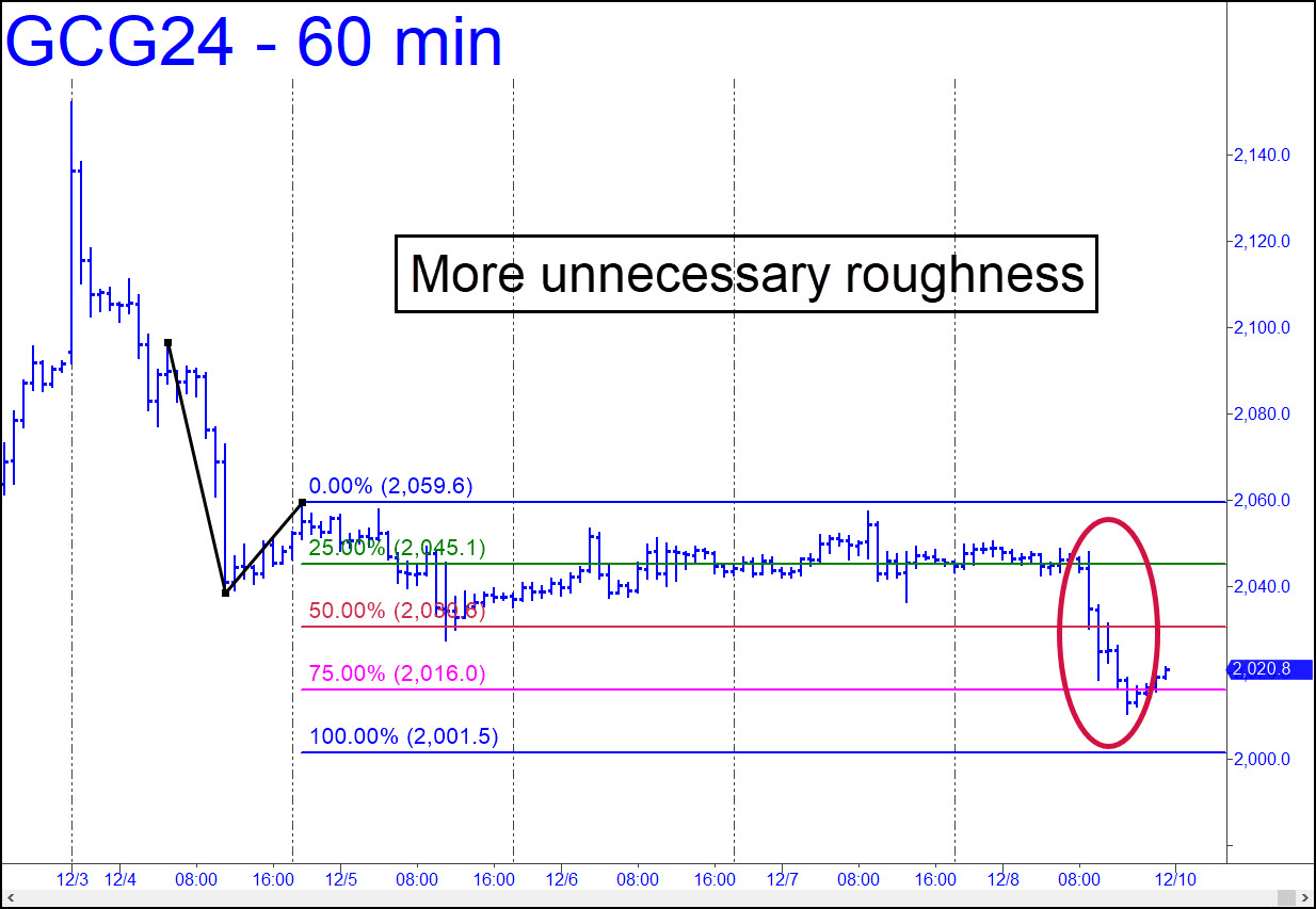 Friday’s dastardly takedown put the February contract on course for a drop to at least 2001.50. If that Hidden Pivot support fails to brake gold’s fall, look for more slippage to 1986.90, calculated by shifting the pattern’s point ‘A’ high five bars to the left. The scumballs who manipulate gold have demonstrated that they are capable of pulling out the rug whenever they please. However, given the run-up to a new record high at 2152 just before the sniper’s head-shot, it has become more difficult for them to convince us that gold needs to correct much below 2000 while it vamps for a shot at 2200 and higher. _______ UPDATE (Dec 13, 11:03 p.m.): The futures trampolined $65 from within $1 of the 1986.90 bottoming target billboarded above. Everybody happy?