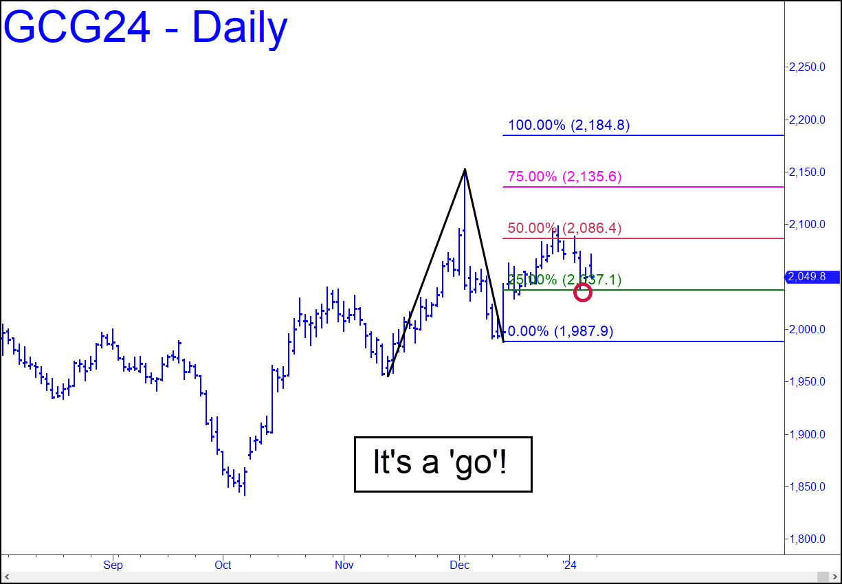 The futures made a little headway toward the 2184.80 target with a marginal penetration of the pattern’s midpoint resistance, p=2086.40. The target is slightly higher than the one given earlier, which used a one-off ‘A’ on the hourly chart. A pullback to the green line (x=2037.10) should be treated as a gift, since it would enable a ‘mechanical’ buy that looks quite fetching in prospect. The implied 50-point stop-loss would demand the use of a ‘camouflage’ trigger designed to cut entry risk by at least 90%. I will furnish timely details if possible, so be sure to check your email ‘Notifications’ if the trade gets close. _____ UPDATE (Jan 5): Sellers pushed the futures down to the green line, triggering a ‘mechanical’ buy with an unacceptably wide stop-loss at 1987.80. I did not put out a trade because there was no a-b segment clear enough to set up a lower-risk, reverse-pattern entry. We’ll spectate for now, but with the goal of jumping in on the long side if the right opportunity comes along.