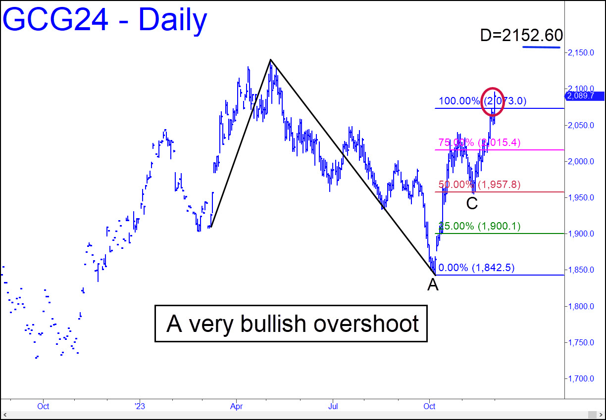 Buyers impaled the 2073.00 target of the reverse pattern shown, implying the futures are on their way to at least 2152.60, the D target of a lesser pattern whose A & C coordinates are shown in the chart. Given the way bulls consolidated above the smaller pattern’s midpoint pivot, the probability is high that D will be achieved with little ado. Since the futures by then will have broken free of gravity at $2,000, we should expect a relatively quick move from 2152 to 2,200, the first round number resistance above the soon-to-be-obliterated one at $2,100. _______ UPDATE (Dec 8, 11:47 a.m.): I’ll bet our old friend Andy Maguire had a thing or two to say about Monday’s psychopathic, whoopee cushion reversal in gold. He has noted that the pond scum who cause these takedowns have a risk cushion of as much as $90 in the arb against unlimited paper gold. Although they are obviously still able to squash gold down to $2000 practically at will, DaScumballs are going to find in increasingly difficult to fool investors into thinking gold deserves to be significantly lower than that. For now, the February contract is headed down to the 2001.50 target shown in this chart — a good place to attempt tightly stopped bottom-fishing. Any lower would indicate 1986.90, an even better bet for bottom-fishing if it is achieved.