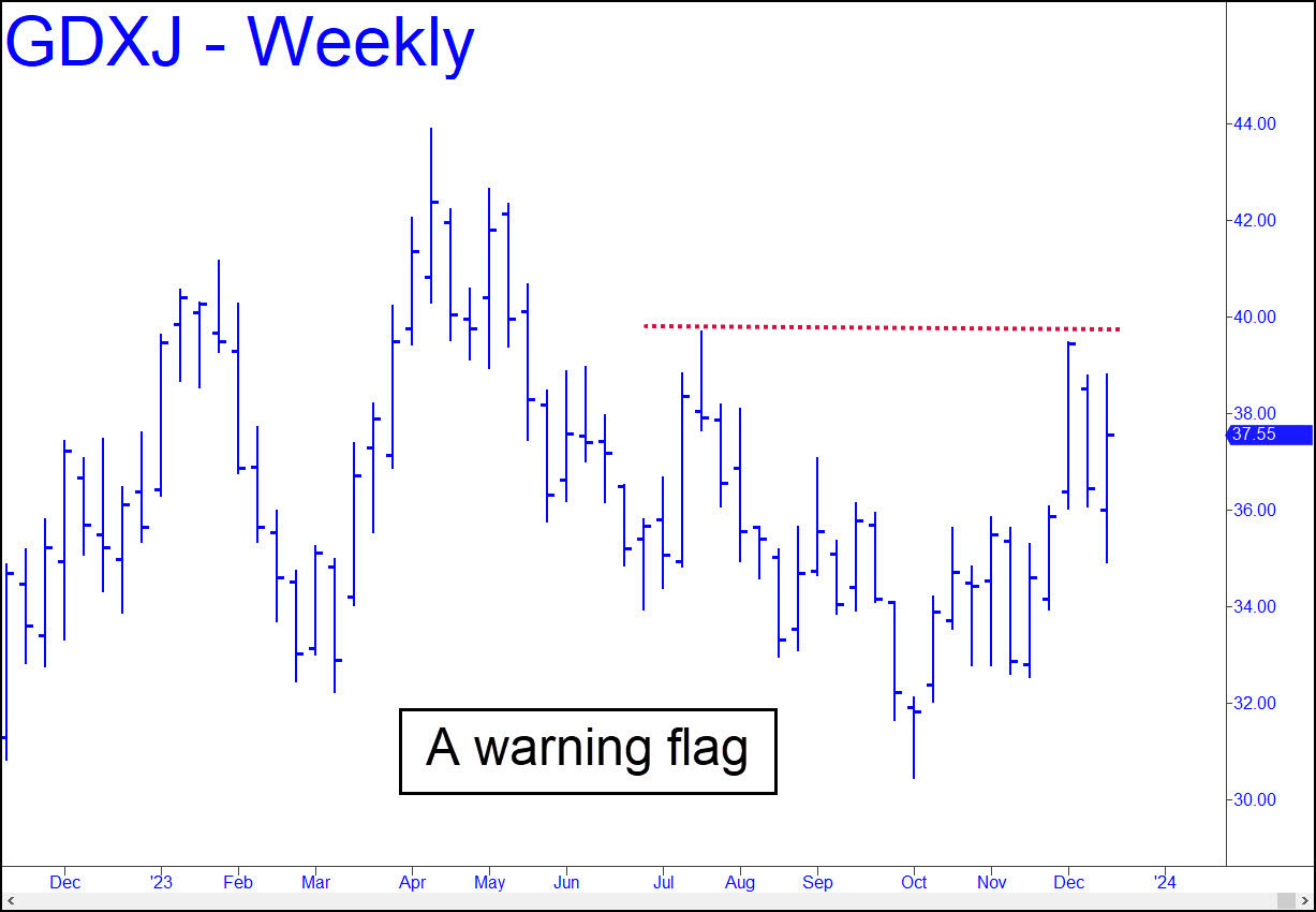 Although touts for bullion vehicles listed just above are bullish, GDXJ’s weekly chart gives us reason for caution. Notice how the recent high at 39.47 failed to surpass the ‘external’ peak at 39.70 recorded in July. This display of timidity, which narrowly failed to generate a fresh impulse leg, is not necessarily the kiss of death, but neither is it very encouraging. It would be remedied by a robust blast above 39.47 this week, but until such time as that happens, I’ll keep the yellow flag unfurled. Am unqualified success would portend more upside to 41.81.