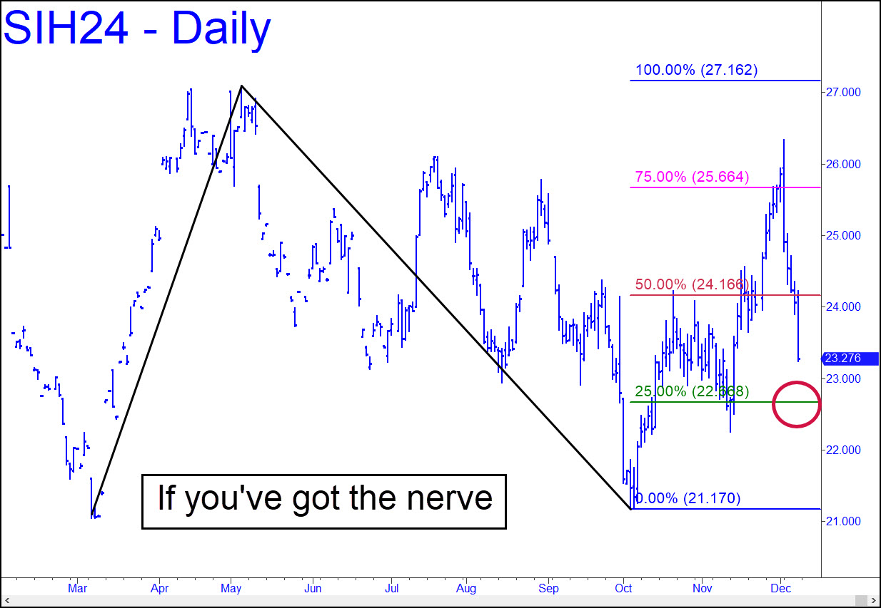 As Silver plummeted on Friday, few subscribers would have been focused on the green line, where the March contract will become an all-but-obligatory ‘mechanical’ buy. Such trades are not supposed to leave one feeling comfortable, and this one would surely qualify as menacing. Note, however, that the implication is not that the futures will necessarily achieve D=27.16 after touching x=22.67, only that they are more like to bounce to p=24.16 than to fall first below C=21.17. We can manage the risk of this opportunity with a smidgen of ‘camouflage if it materializes’, so please nudge me in the chat room if you’re actively engaged. ______ UPDATE (Dec 13, 11:11 p.m.): No one nudged me, but DaBoyz goosed the March contract $1.34 off a 22.78 low that missed touching my green-line ‘launching pad’ by 12 cents. Our attention is now on this very tradable pattern, with a 25.47 D target. The slight overshoot of p=24.13 implies that D is no worse than an even bet to be reached.