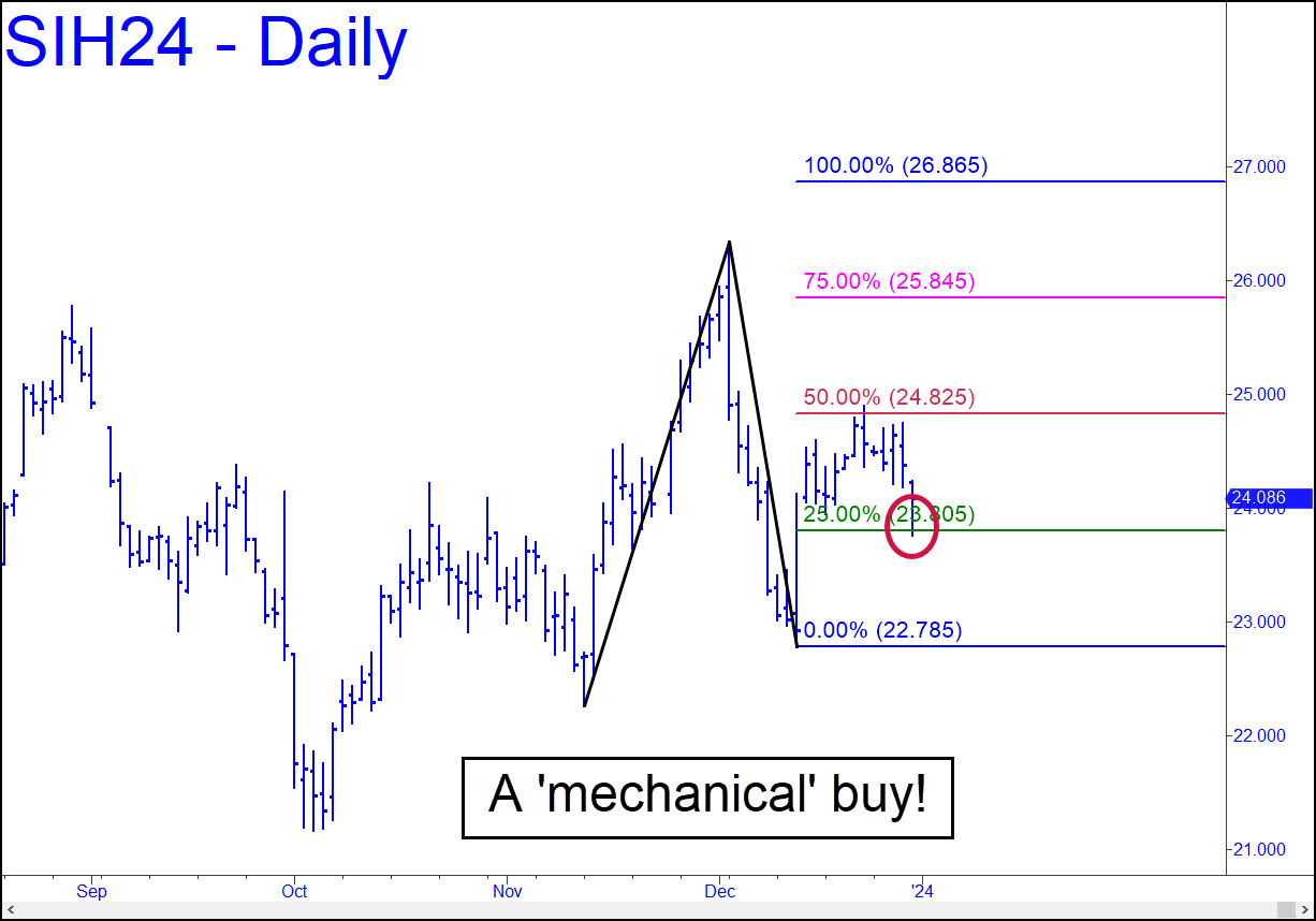 Friday’s selloff early in the session put Silver a tradable step ahead of Feb Gold, since it triggered a ‘mechanical’ buy at the green line (x=23.80) that has yet to occur in gold. There are no guarantees that the theoretically profitable bounce that occurred subsequently will keep on going, but the bullish signal would remain viable nonetheless, even if the futures slip beneath 23.80. The signal offers no assurance of a further move to D=26.86, only the likelihood of a profitable one-level move from x to p.