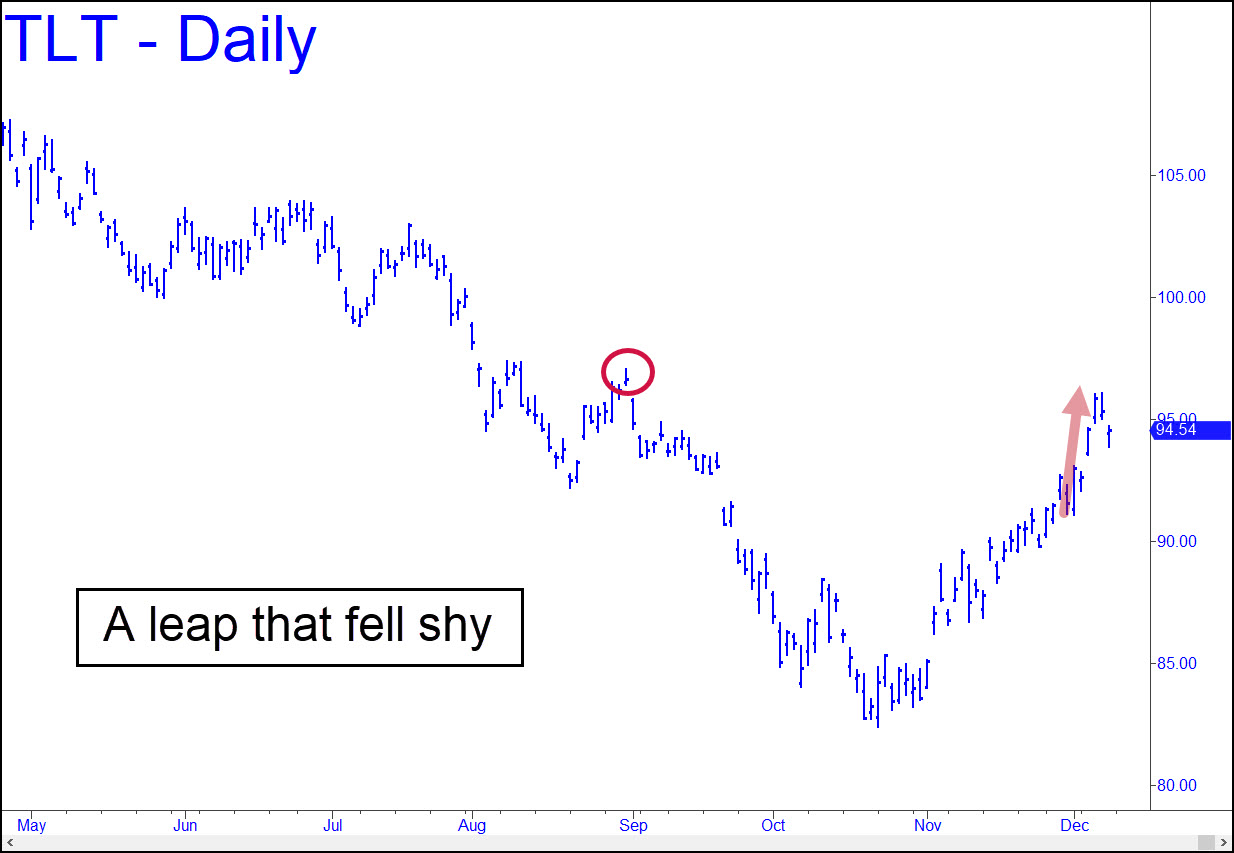 TLT’s leap last week, which left two bullish gaps on the daily chart, was less encouraging than it seemed. For an uptrend to remain healthy, it must continually renew itself by surpassing a prior peak with each new upthrust. Although the latest thrust did exceed a cluster of small highs recorded in mid-September, it failed to go the extra inch needed to get past August 31’s summit at 97.05. An energetic upward reversal early in the week could rectify this shortcoming, but if TLT simply drifts sideways-to-lower, it would diminish the putative strength of the ascent begun from 82.42 on October 23. I am being finicky to avoid overlooking the possibility that interest rates have merely been correcting, and that Powell plans to let market forces take them above 5%. ______ UPDATE (Dec 13, 10:51 p.m.): DaBoyz on the night shift have succeeded in wafting TLT as high as 97.14, surpassing the Aug 31 high. The move is therefore impulsive and will refresh the bullish energy of the daily chart.