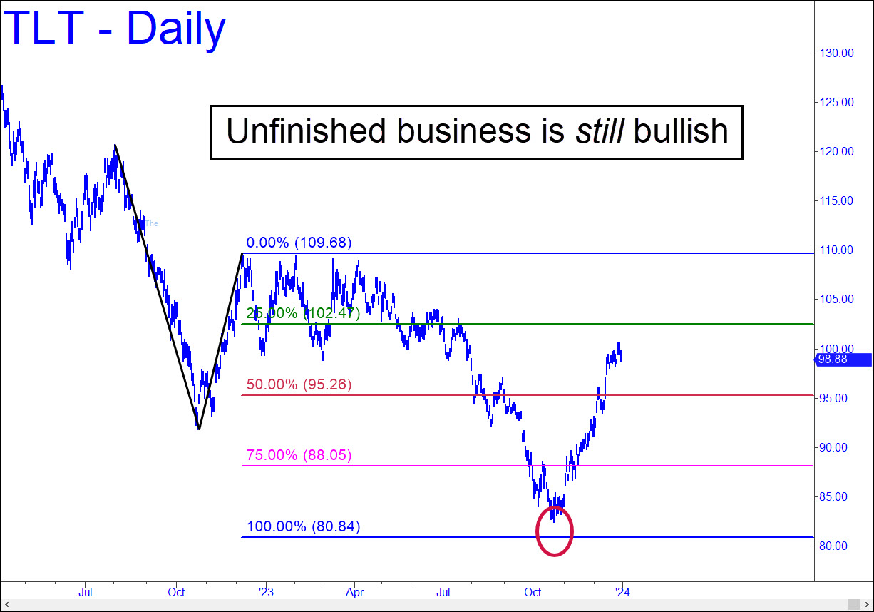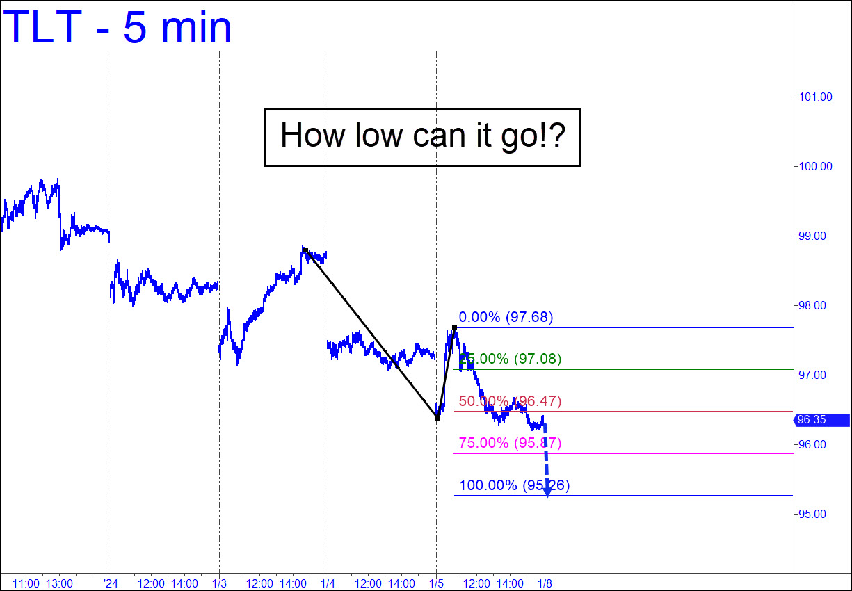 We used a rally target from the weekly chart to buy put options last Wednesday for 0.19, just pennies off their all-time low. By week’s end they had traded for as much as 0.43, giving subscribers an opportunity to cash out of half of them for at least twice what they’d paid. This effectively lowered their cost basis to zero, giving everyone a riskless position with a week left on it. The chart shown is bullish, but if this corrective move picks up steam it could yield a fat gain for everyone. I recommend holding at least a fraction of the original position until Friday afternoon, when the options expire. _______ UPDATE (Jan 2, 6:47 p.m.): The puts traded as high as 0.72 today, nearly four times what we paid for them, so you should be out of at least half of your position. _______ UPDATE (Jan 5): The puts that subscribers bought for 0.19 or less a week ago traded for ten times that today, yielding exceptional profits for anyone who did the trade — even those who bailed out early. I’d explicitly advised holding a few puts until they expired (see above), a strategy that paid off at jackpot odds when T-Bonds relapsed following an opening-hour short squeeze. Now, the plunge could continue to as low as 95.26 over the near term. Here’s a chart that shows the target.